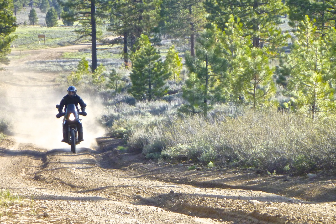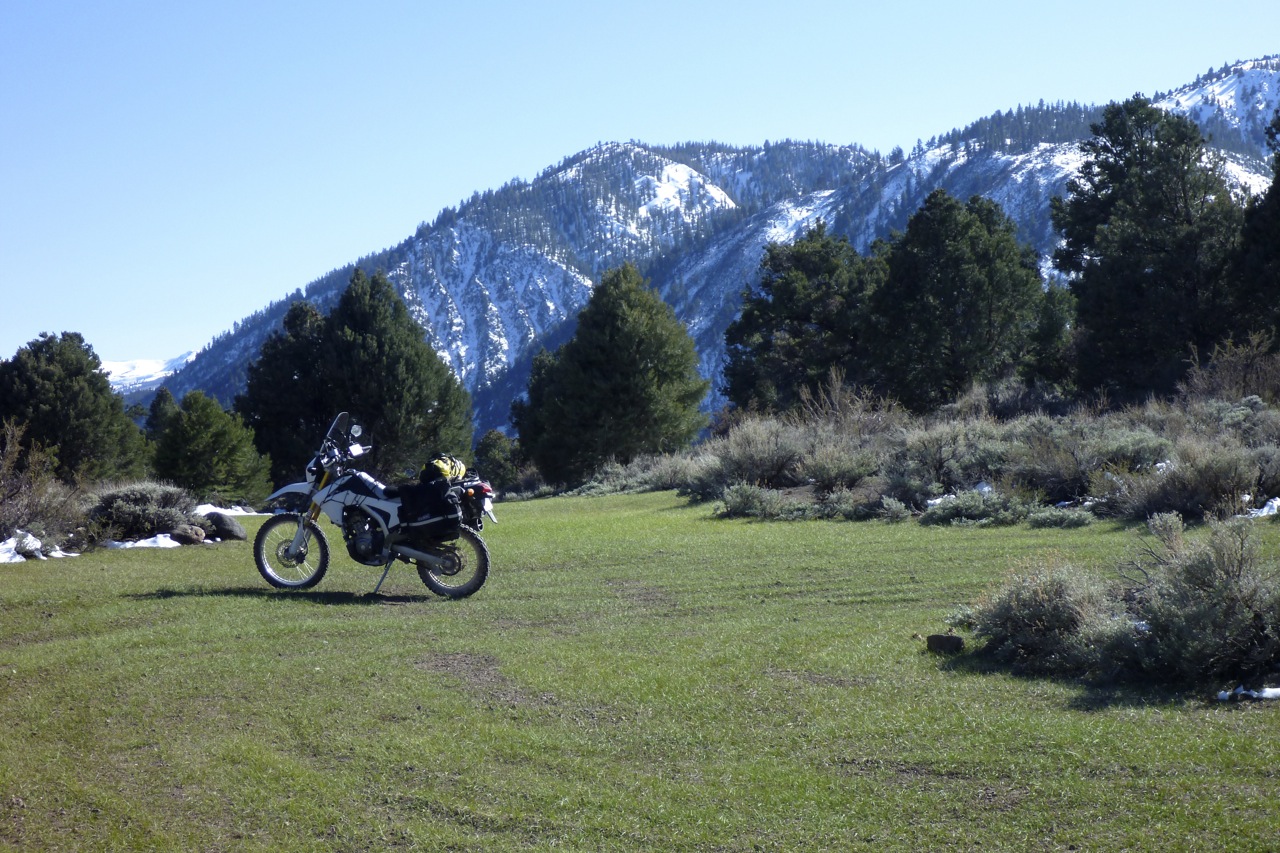 There’s got to be a name for the sort of dirt you get up here in the high pine country – a kind of sandy loam that agrees very nicely with the L’s tyres. Soon I passed a parked up MAN overland truck – Germans to be sure saving a penny and having an adventure. Then up ahead I came to a flat grassy clearing and wondered should I camp – this nightly moteling is getting expensive after all. The place was on a pass, exposed and with little cover from the wind, but dry and with some firewood. I dithered and looked for a sheltered spot but then checked the satnav again: 8034′ – I don’t think so. It will freeze for sure and with only my flysheet for a tent I’d spend the night huddled against the chill. It will warm up somewhere sometime soon.
