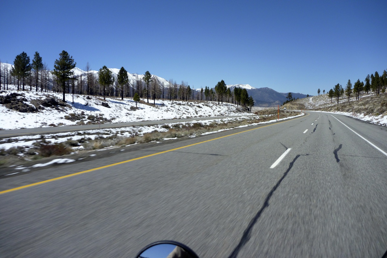 By the time I got to Mammoth town I had some power loss but I’ll accept that – I wasn’t feeling so sprightly myself. Mpg at the servo clocked in at 58US or 70UK – that will do nicely. The snow barrier was only a couple of miles on at around 8500′ and to me was just your regular alpine scenery – pretty enough but nothing very Yosemite on this side at least. I swung back down to the 395 and continued north sitting at around 7000′, snuggly wired in to my Aero Kanestu vest. Where yesterday I could barely crack 40 now it was pulling up to 65.