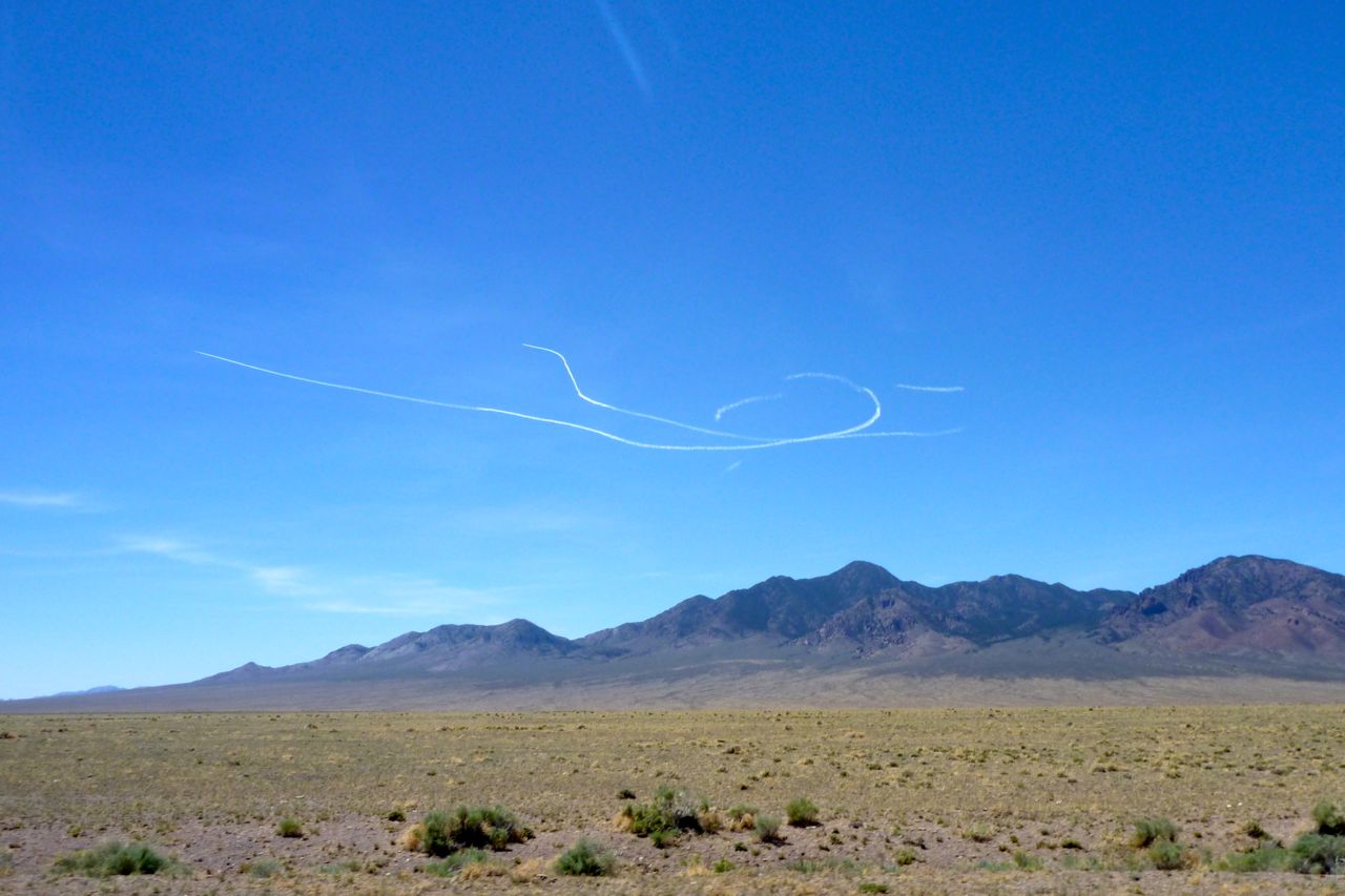 As I pass Nellis I wondered whether I’d see any sign of the sinister activities that make the place famous amongst the tin foil hatters. Those vapour trails are not a Boeing 787 being put through its paces, that’s for sure. Two jets fly off into the ionosphere at high speed.