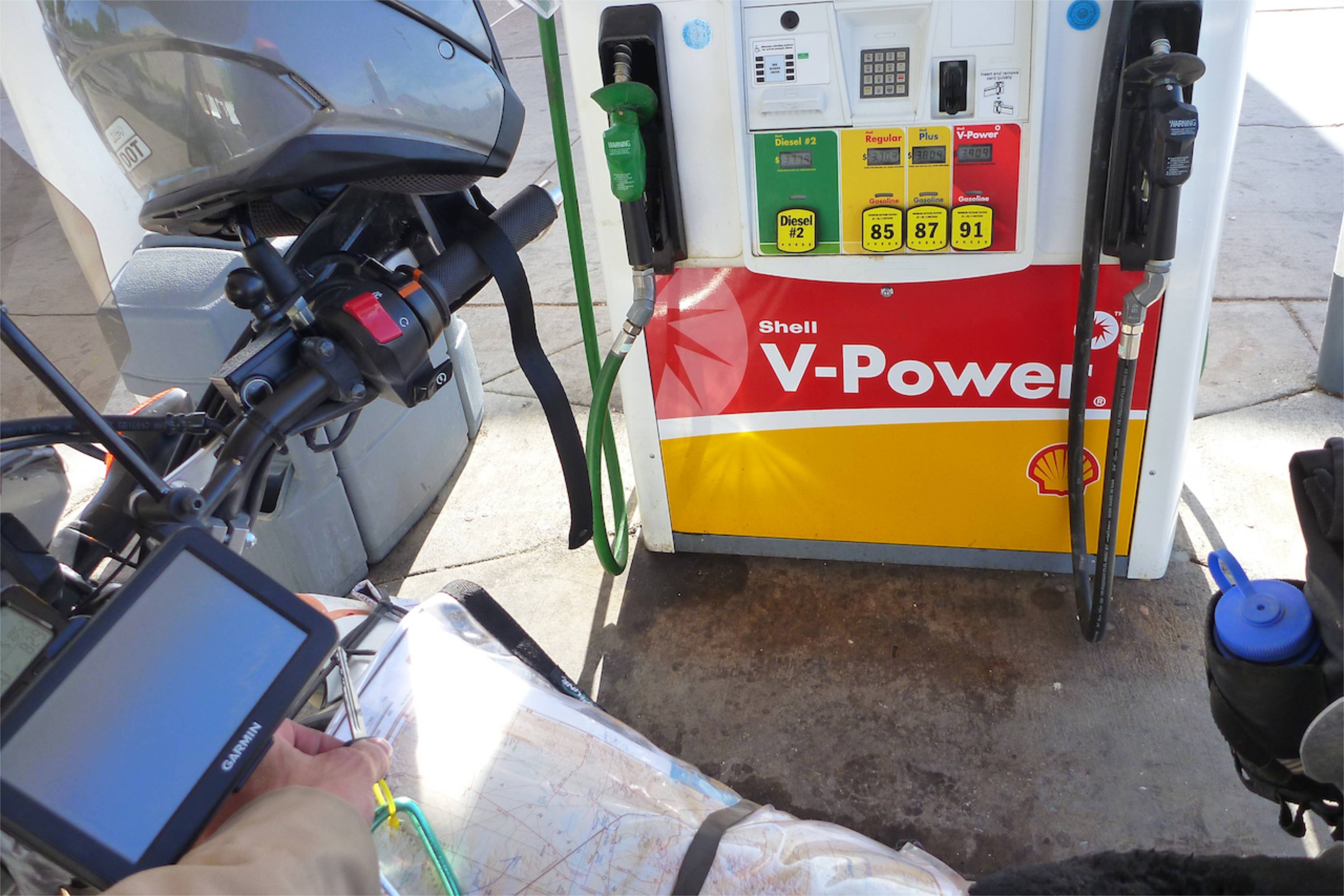 On the far side I take the dirt road south, passing a few ranches, like where The Virginian used to work. Benchmark maps are a great nav resource when combined with a Nuvi, but I could be on the limit with fuel although it’s getting much more economical. I poured in a gallon can after 80 miles and the tank was full. Here I am updating my fuel log. I was going to camp here but…