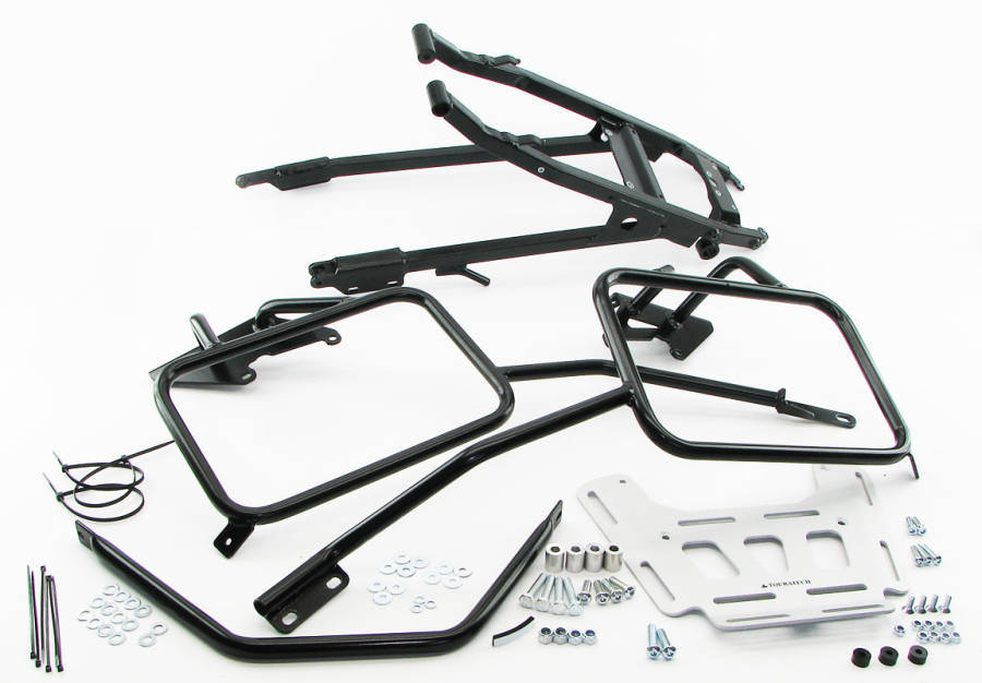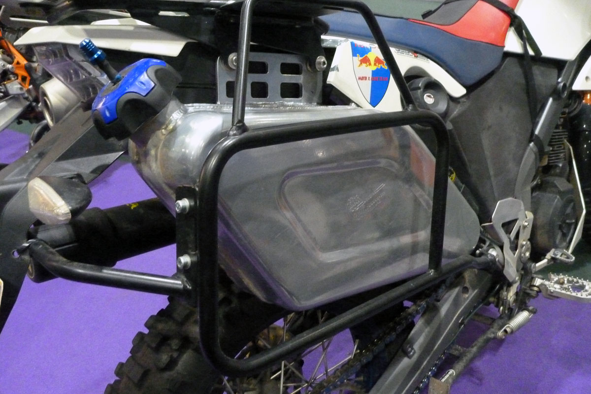 Blink and you’ll miss the fact that the XCountry was the only Xbike that came with pillion footrests and too much wayward pillioning on the original alloy subs common to all three models brought up cracking issues so a steel version was quietly slipped on. As is well known, Touratech sell a replacement steel subframe for all the early Xbikes (separately from the pannier rack, also shown below right). It weighs 4.7kg against the original alloy’s 1.9 – another example of overzealous weight savings on the X range, though of course it depends very much how you load and ride your Xbike. The yellow XCo’s steel subframe bolts onto an earlier alloy model without a hitch.