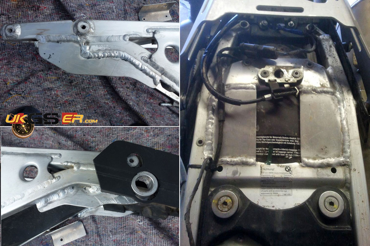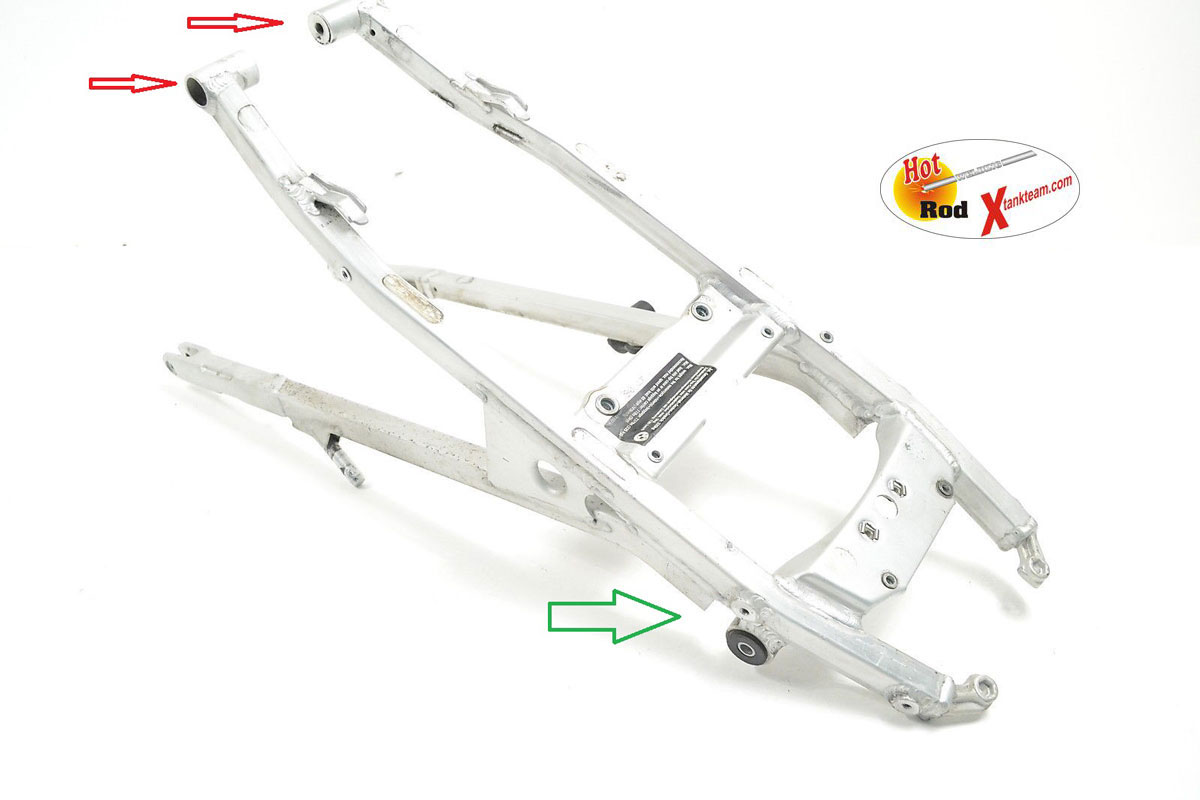 Xman Erik in NL can upgrade your alloy subframe; beefing up the stressed-upon upper mounts (red arrows) and replacing the alloy threads with steel inserts (green arrows). That plus the bracing as shown above right will make your alloy Xbike subframe as good as it can be and may work for most overlanders.