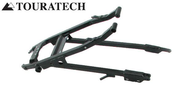 A better option: fit a Touratech steel subframe (left) which TT brought out early on for the XChallenge to carry their luggage frames and alloy boxes. The original alloy frame would never handle that sort of weight on rough ground, whatever you did to it. Those steel subframes (TT p/n: 05-049-0600-0; left) can be bought independently from the whole luggage kit for £420 in the UK, but I was told were unavailable for months. Hot Rod Erik often takes in TT steel subs and modifies them to suit his Xracks and Xtank.