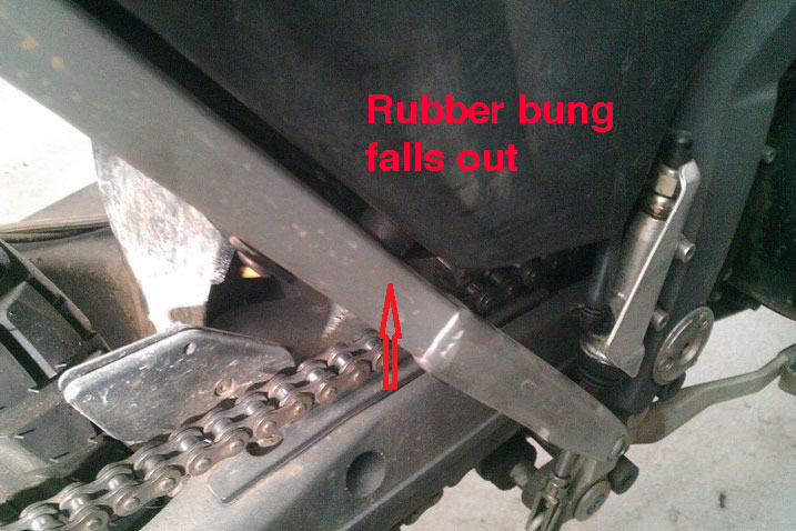 Press ‘play’; Remove seat; silencer; rear light assembly; mudguard and undo associated wiring and the fuel breather. After about an hour you’re at the point where you can undo the four (pre sprayed) subframe bolts and the two rear fuel tank bolts. Then just tug the frame backwards (right). Away it comes and the tank stays in place. As simple as that. The new steel unit is an exact replica. Everything goes back on just like it came off. No gnashing of teeth. The only thing I missed was spotting the rubber bung which dropped out from between the tank and diagonal frame rail below the filler cap. That should slip back in later if I loosen the tank mounts.