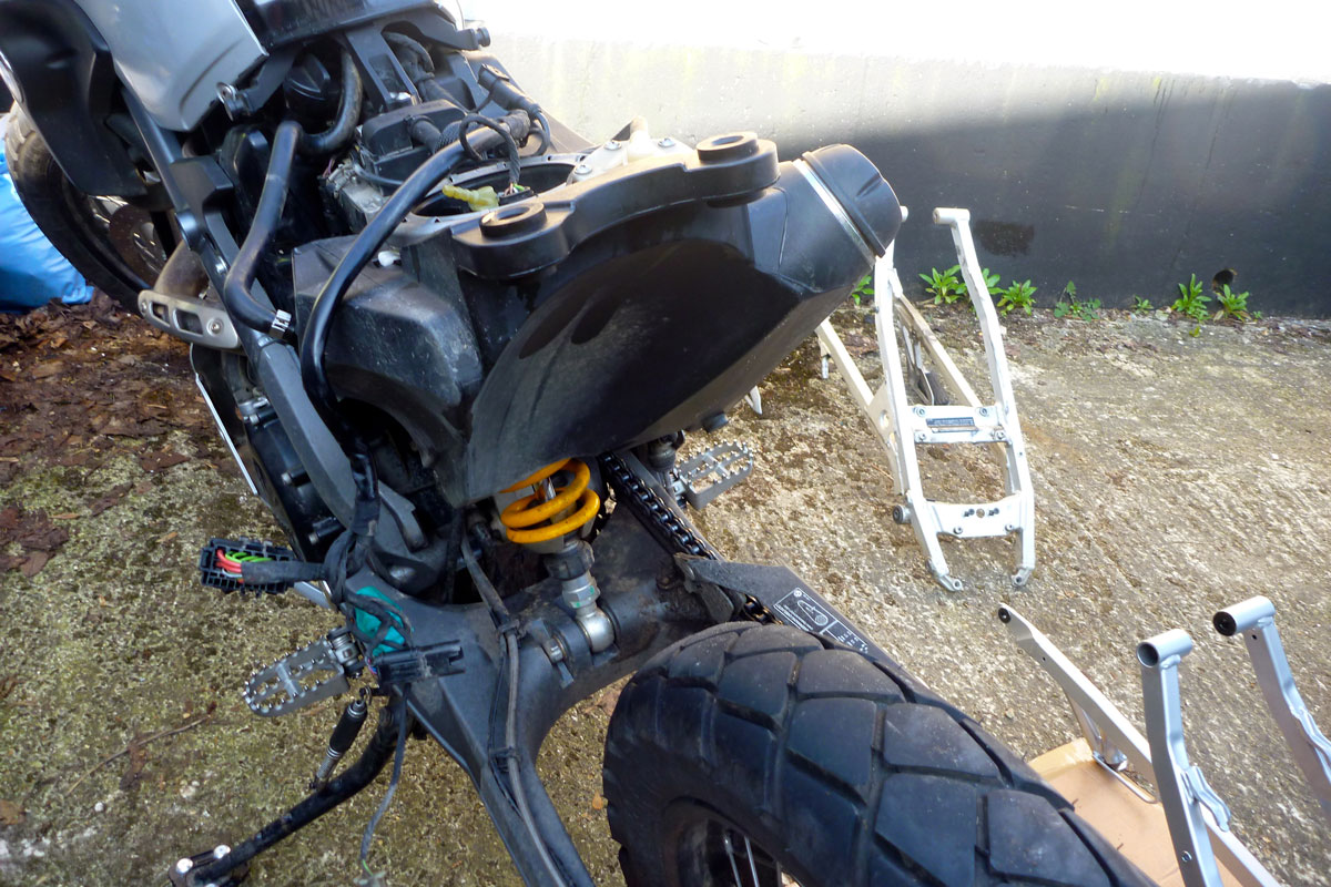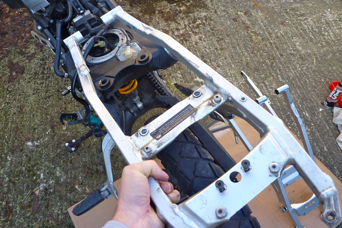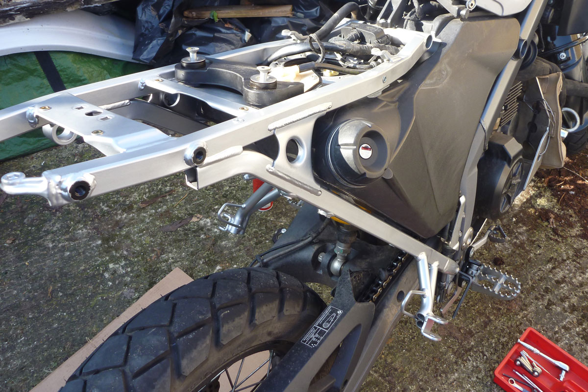 Five hundred quid for a steel subframe – is that nuts? If you’re adapting an Xco into a travel bike I don’t think so. Whether from BMW or TT, I believe a steel unit is the single best solution to the Xbike subframe issue. A full Hot Rod upgrade on an alloy one (even done in the UK) might cost up to £200 and it will still be a torsionally weak alloy sub. I didn’t hesitate long before ordering a BMW steel unit and if money’s that tight, when my bike’s job is done I can swap the alloy back on and flog the steel on for a good price.