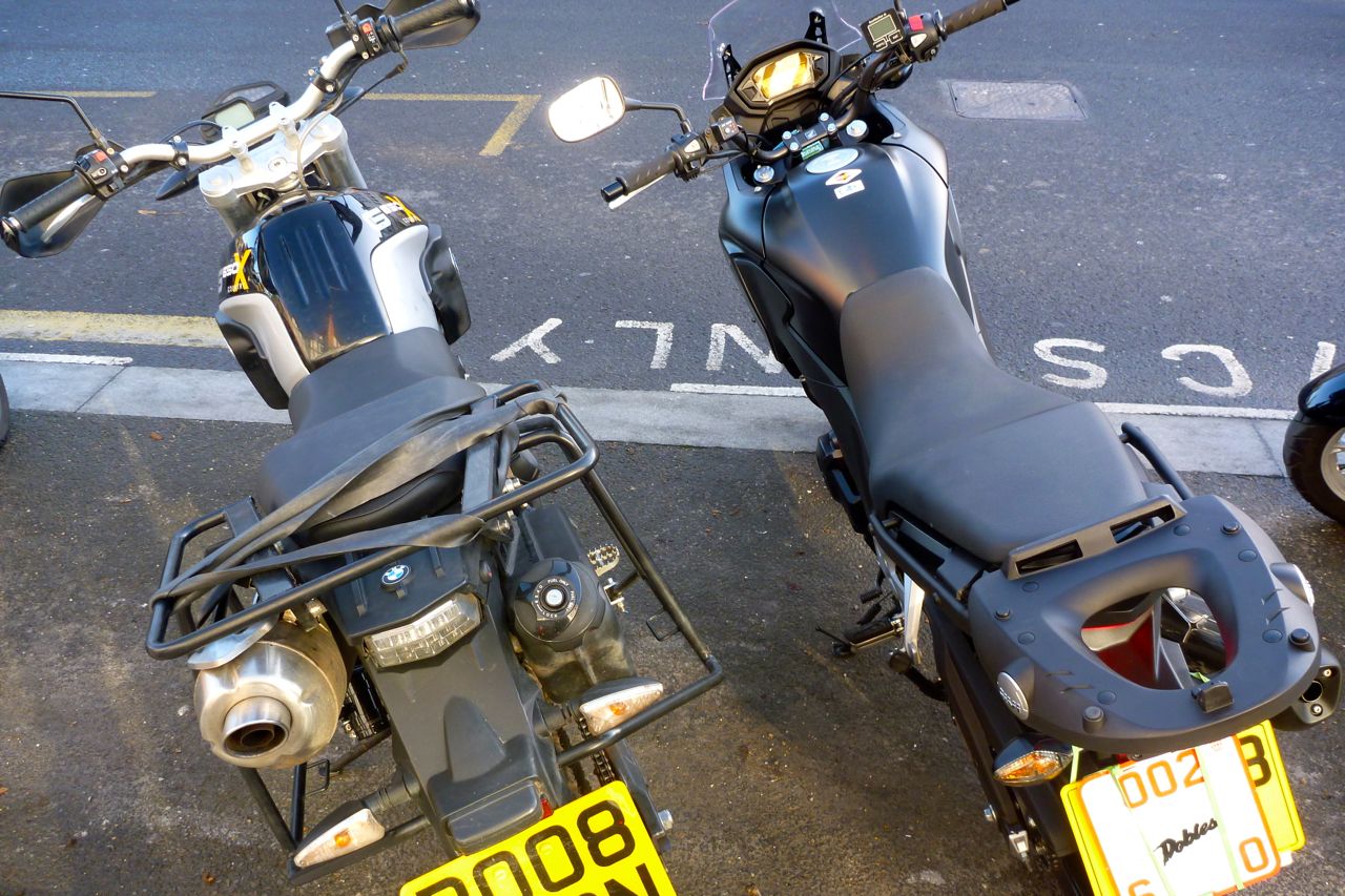 This 9000-mile-old 500X had some welcome Oxford heated grips plus one of those over-complicated electronic Scott chain oilers (more here). On the back was a Givi tail rack which hangs out like someone walking the plank and is an ergonomic abomination. I’ll have more to say about that in the near future. I know it’s convenient and all, but the thought of a  top box perched way out there is enough to make me want to call the Samaritans.