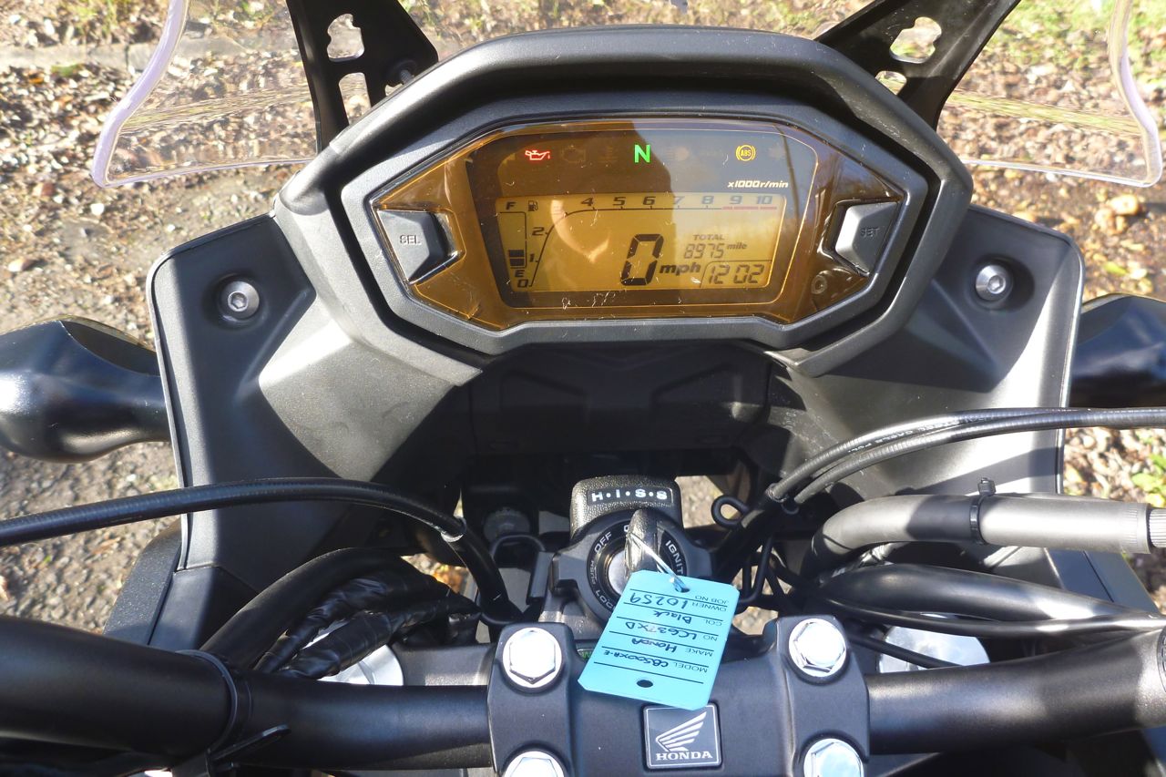 Under the seat – good lord, an actual toolkit in the grey PVC pouch that Honda have used since Fritz Daimler crammed a steam iron into his pushbike. What I could see of the subframe looked chunky enough for luggage duties. Over on the dash, there’s more data than my XCo: digital rev counter, clock, fuel gauge, trip, current/average mpg – all good once you decode it. And for a bike that’s put together in Thailand or China or a bit of both, the fit and finish was reassuringly solid – better than my BMW. With its 17.5-litre tank you imagine the CB-X could get up to 400km (250 miles) to a tank without too much effort (in fact make that nearer 550km). Clad in dark grey plastic, I like the angular ‘early-Batman-movie’ styling too. Interestingly, the previous owner (‘a younger person’) PX’d this bike for an Integra super scoot. Is there a message there?