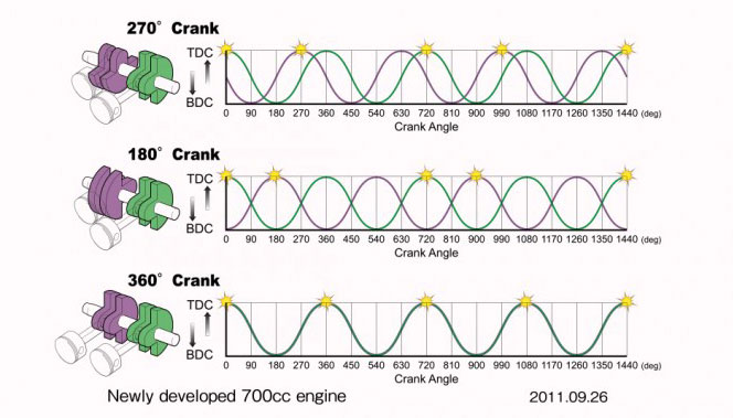 It’s the ‘Big Bang’ theory of unsynchronised but closely paired – rather than evenly timed – power pulses, as illustrated in the Honda graphic, right. That was produced to illustrate the benefits of their 670-cc moderate-power/high-mpg Integra super scooter and the closely related NC700 models. Above left is a manual (non-DCT) NC700X getting tested by RideApart in Nevada. Nice, but a bit heavy.