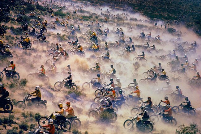 In the late 70s I gobbled up the seminal Dirt Bike magazine from cover to cover – and most of their riding was done out here, east of LA. DB founder and editor Rick Sieman wrote up his ‘Dirt Biking Years’ as Monkey Butt, the memoir of an increasingly bitter individual who saw his opportunities to gun across the Mohave scrublands slowly eroded by the rise of the Joshua Tree-hugging environmentalists. In the good years the iconic, non-competitive Barstow-Las Vegas run (‘B2V’, below) had a start line of some 3000 bikes spread out a mile wide. By the late 80s the B2V got outlawed by the BLM, Rick Sieman did time for protesting/trespassing then emigrated to Baja in disgust. But as the fully legal  LAB2V, a form of the event still survives.