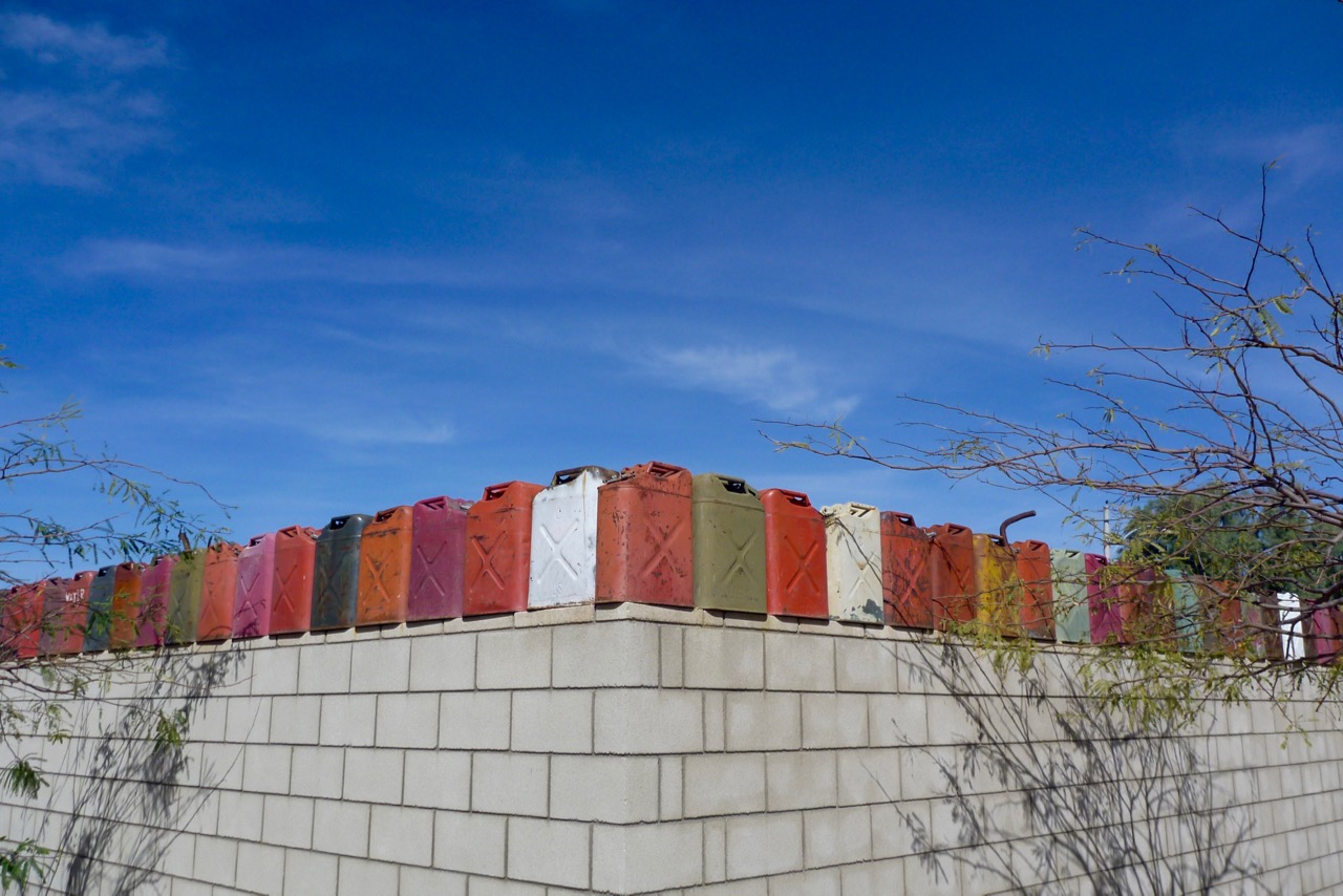 In Joshua Tree town the cheap-motel manager claims she’s ‘full’ but then relents and apologises for mistaking me for ‘a local’. I get this suspicion at other lodgings too – presumably highway-roaming two-wheel reprobates with swastika tattoos on their foreheads take the piss or cause trouble. Opposite the hotel the neighbouring compound had a colourful row of what I call ‘Ameri-Cans‘ capping the wall. Inside I try to watch TV for some added cultural immersion, but it’s a lost cause – you can literally channel hop from one commercial to the next.