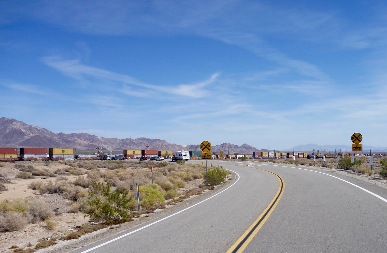 There are roads leading north up to Amboy and Kelso next day. I kind of hope they’ll be wide gravel dirt with shady borders, but will take what I get. Out of 29 Palms it’s actually deserted crumbling blacktop, like parts of old Route 66. There are a lot of east-west railroads round here, all converging on LA I presume. At Amboy, an old rail depot, we stop at a crossing to watch a mile-long BNSF train pulled and pushed by six locos. It’s a cue for another song and a ‘so-that’s-what-it-means’ explanation of its lyrics: