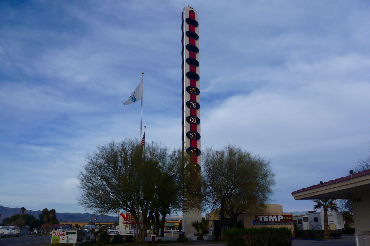 Baker is alongside I-15 and its famous Pole of Temperature (left) is reading 85°F, but by the weekend the weather is set to turn. Storm off the Pacific, wind and rain by Sunday they say.