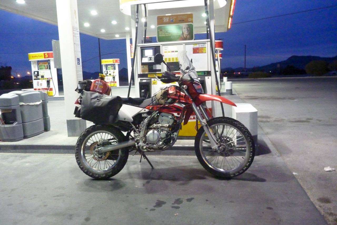 The day turns into a tiring 9-hour, 350-mile haul of wind-surfing with the butt clearly getting acclimatised to the KLX perch. All up not so bad on a weedy 250. Must be high time to tank up.