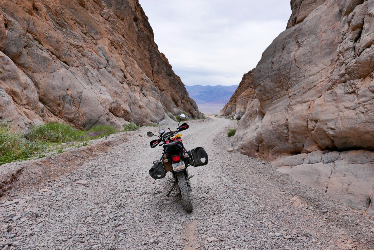Titus is even better than I recall – a classic one-way route which, after an initial washboard approach, winds up to a high pass from where I’m able to switch off and coast almost right to the canyon mouth, peering across the arid pans of Death Valley. Without the engine distracting you, riding the KLX is like being on an oversized mountain bike, you can focus on the lines and body position while slipping silently past lumbering 4x4s.