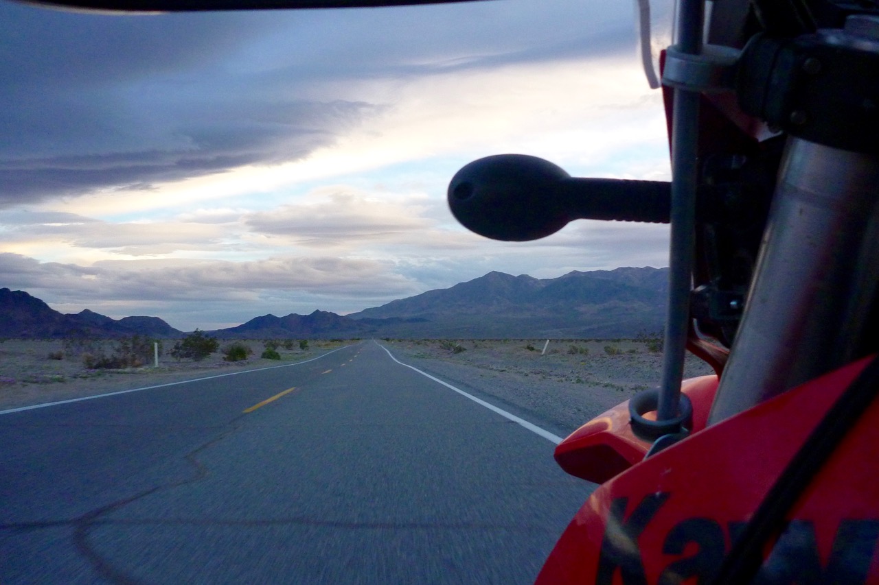 Jeez, is that the time? Must be overdue for a fill up again in Shoshone at more than double the usual price. There’s a WR250R doing the same. Turns out the guy picked it up only yesterday for $7k, equipped. I’m looking for one of these for an upcoming Sahara trip where anything heavier will be a liability – at least at my age. Nice to see a fresh WR in the flesh – a good omen I tell him. Triple clamps off a JCB, they make 30-odd hp, do 70 to Her Majesty’s gallon but don’t require WR-F-like levels of care. Or so they say. The guy is usually a Victory cruiser (like half US riders, it seems), but wants to explore the dirt side. Good on him, I say.
