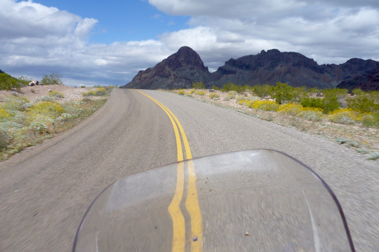 Baker’s too close to the interstate to invite an early cut, but up the road in Shoshone there’s no room at the village inn. ‘Pahrump is your nearest bet, honey’. Another 30 miles and it’s nighttime in Nevada. Fill up at the servo – it’s all I ever seem to do. ‘Motels? Right at the lights’. Once installed, I whizz back to casino-lined downtown helmet-less for my bi-annual BK. Is Nevada helmet-free? Probably.