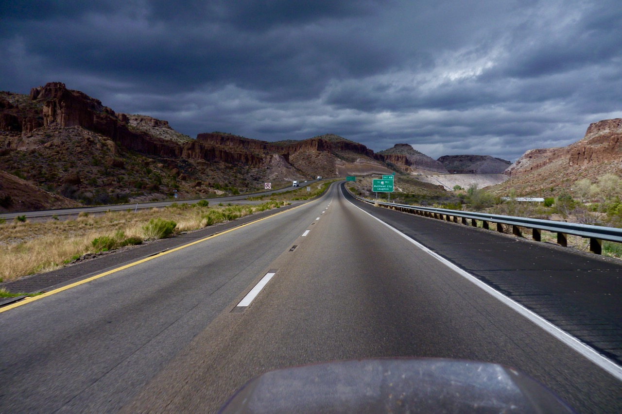Near Kingman dust storms are hurtling around the valley looking for something to blow over. East along 1-40 I am sailing but turning south onto 93 it’s largely in my face and when it’s one lane I sense the tailback’s trigger fingers getting itchy. It’s the occasional price you pay for riding a 250. It rains a bit but I dry off even quicker and ease into Wickenburg on fumes.
