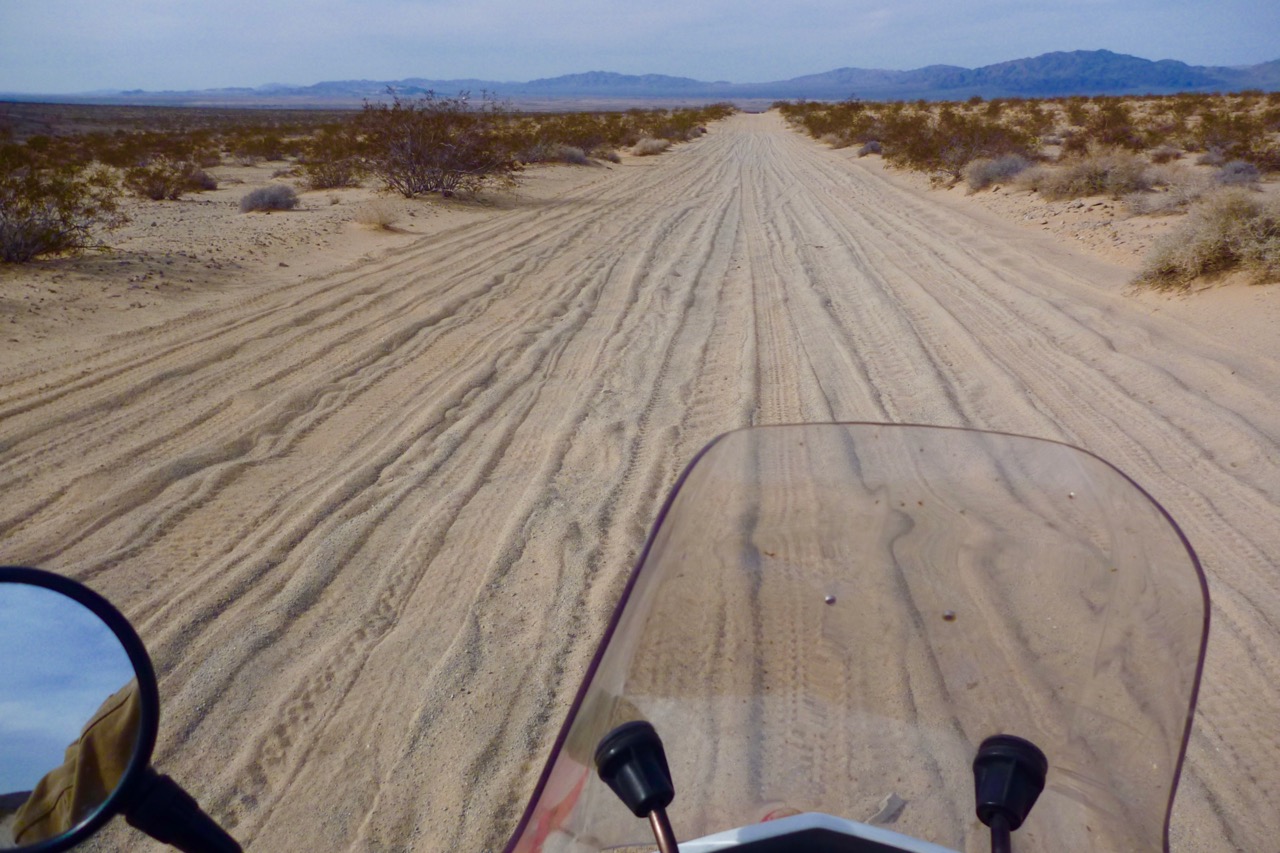 Out of the hills and back on a broad sandy runway, the bike is handling much better now. It occurs to me the energetic workout has reformatted my reflexes in tune with the bike’s bucking and sliding. Well, that plus lower shadows are now across the track, raising the definition.