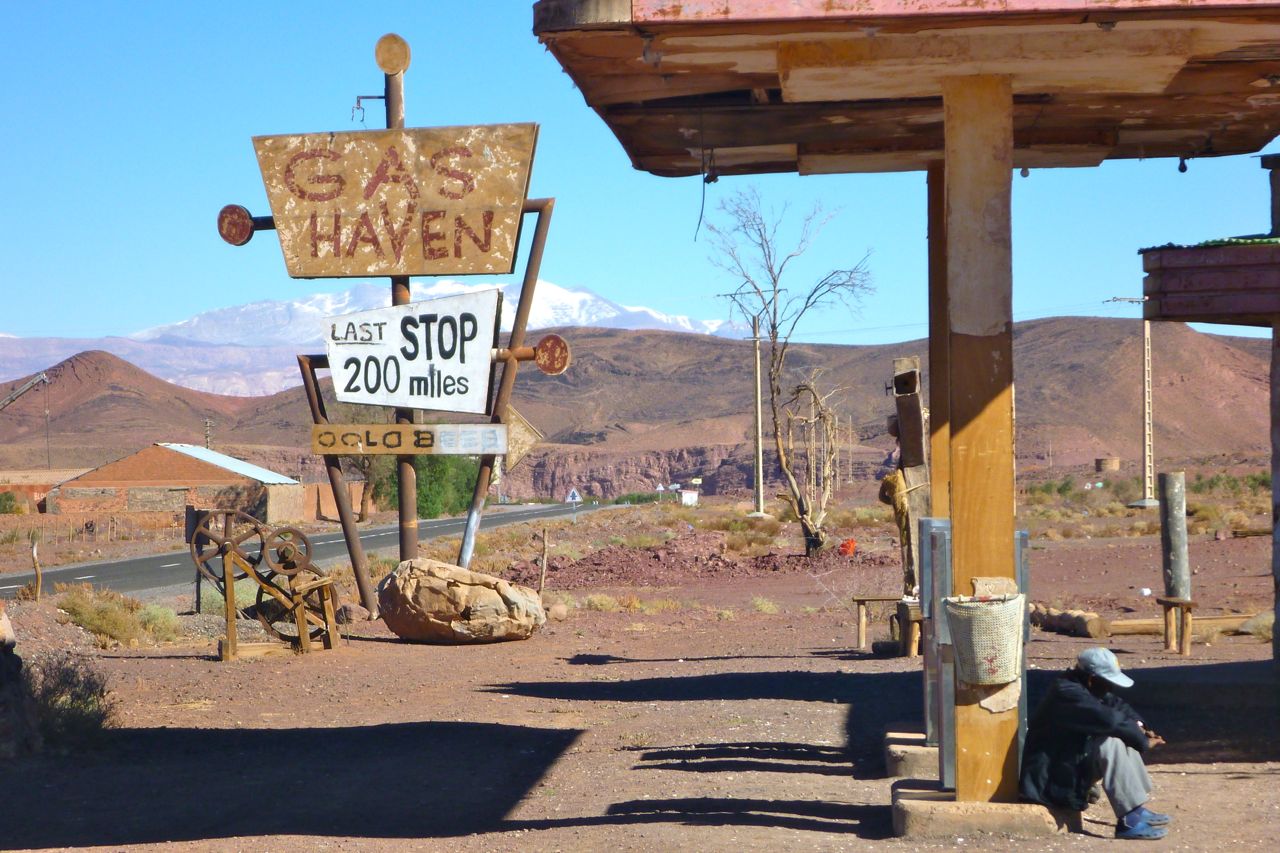 Just like last time on the CRF, my ingrained thrift saw me fill up on 87 fuel – they wouldn’t sell it if it was bad, right? Wrong. My new ride was soon running like an MZ on watered-down kerosene and hit reserve at only 88 miles, somewhere east of Salome. Still, getting off to top up the bike was a relief. I refilled at a ‘Gas Haven’ roadhouse – the one pictured above is an old Hills Have Eyes movie set in Morocco. You’ll find the real thing all over the Mohave and the Southwest.