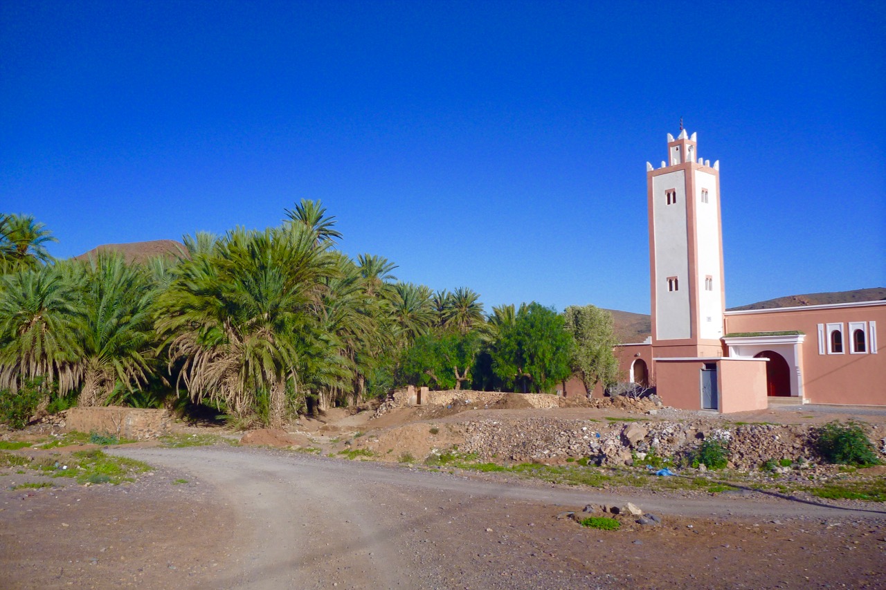 The new road ends at the mosque by the oasis. Pass through the gap in the hills and carry on west