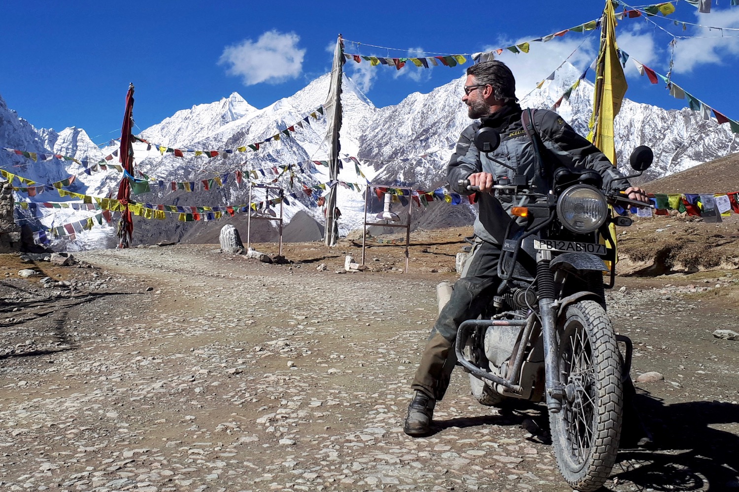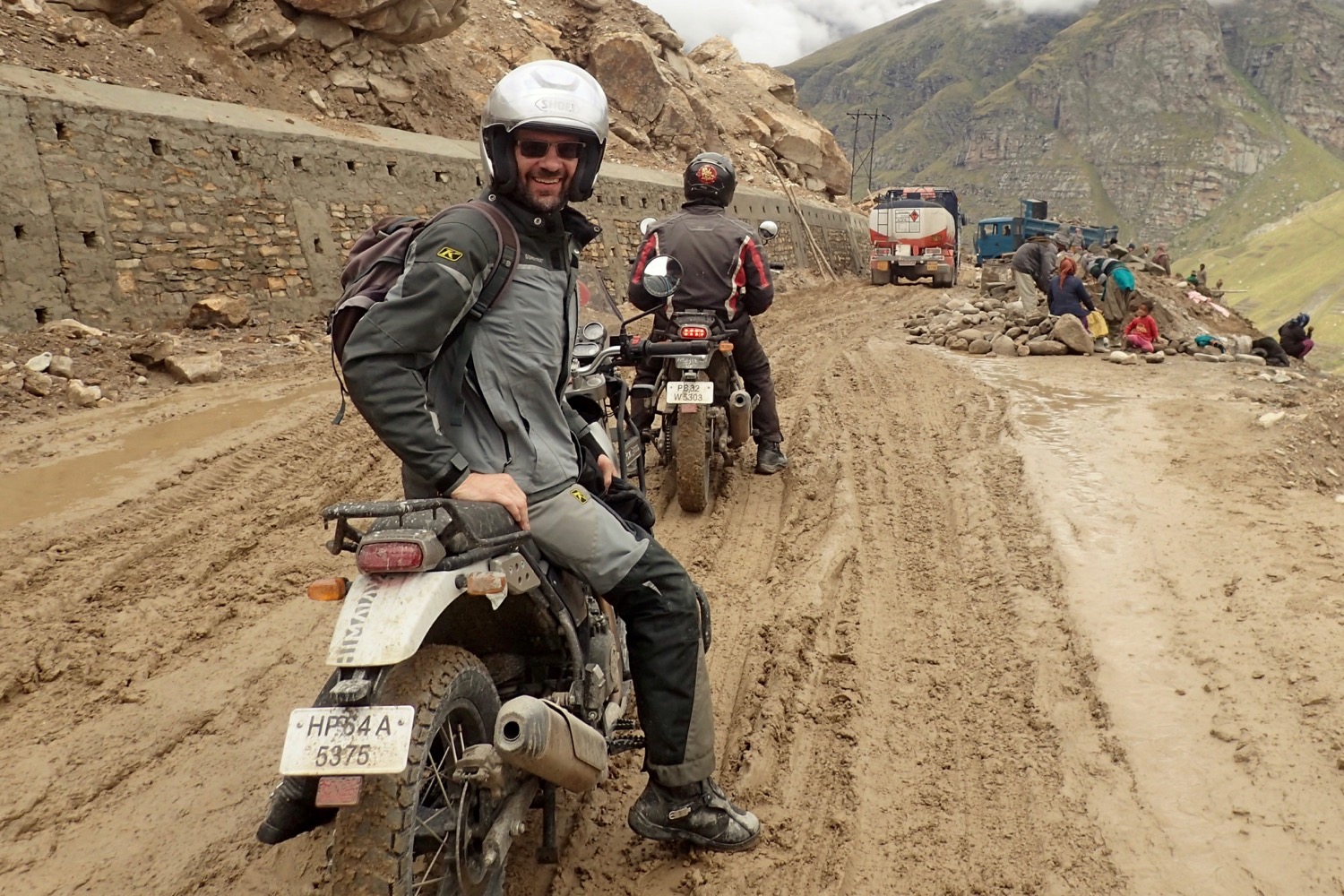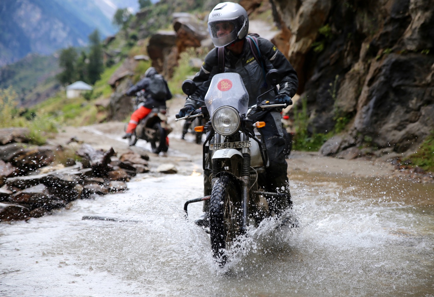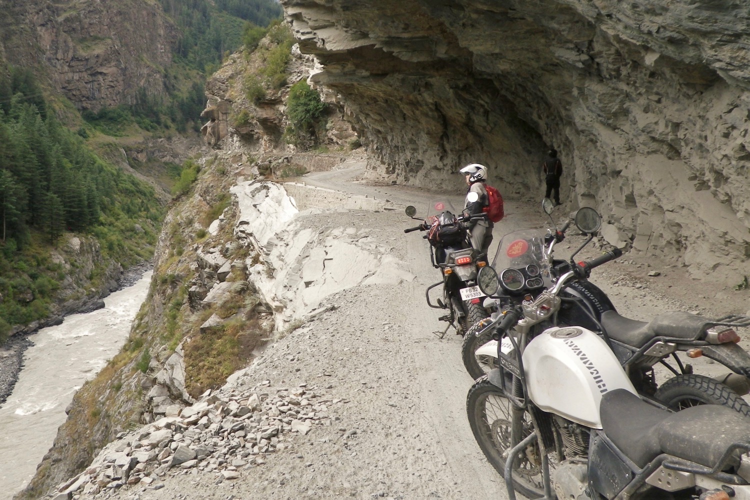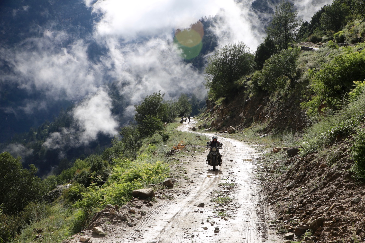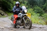 The climb ahead of us resembled something I’ve encountered many times trail riding in Wales or Devon; a steep, rocky ascent of loose stones with mud, water and a thought-provoking drop to one side. The difference here was that the drop to my left was at least 1000′ straight down to a distant river, and the tyres on our bikes didn’t look like they could grip their way out of a wet paper bag. Despite that, the Enfields bounded up the slope like a Himalayan oryx, quite an achievement considering that some in our tour party had little off-road riding experience.