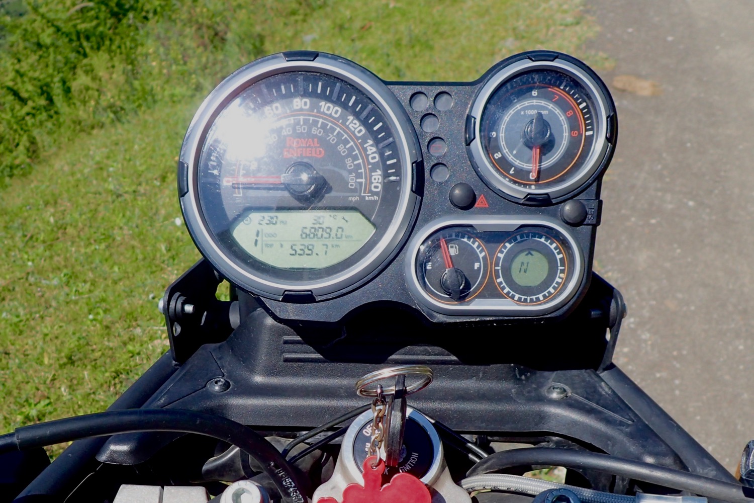 The analogue instruments have enough of the information and features you’d expect of a modern bike, plus a couple you wouldn’t: oil temperature and an electronic compass. I love the latter idea; in a country where fitted GPS is rare, it helps affirm you’re heading in the right direction.