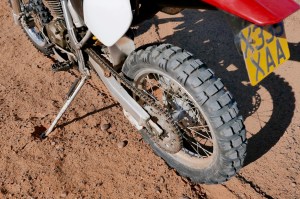 My XR showed 8550km (5300m) on the clock and looked in good nick. It had a small rack, bashplate and an OK front tyre so not much needed adding of fixing for a fortnight in the desert: a new Mitas E09 on the back with Slime in the tubes and self-tapers through the rims to stop tyre creep.