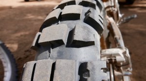 The rear Mitas E09 (non Dakar; 1 less ply and a bit lighter) wore very well, (right: after 1000 miles), but on the sands 1 bar / 15psi was still too hard for this stiff tyre on a light  bike, even with my weight. On the last day on sand I tried 12psi (~0.8 bar) and noticed less squirreling when pulling away and improved traction elsewhere. Tough as a Michelin Desert but less than half price, I’d use one again for similar riding. I had no punctures (nor did anyone else on this trip).