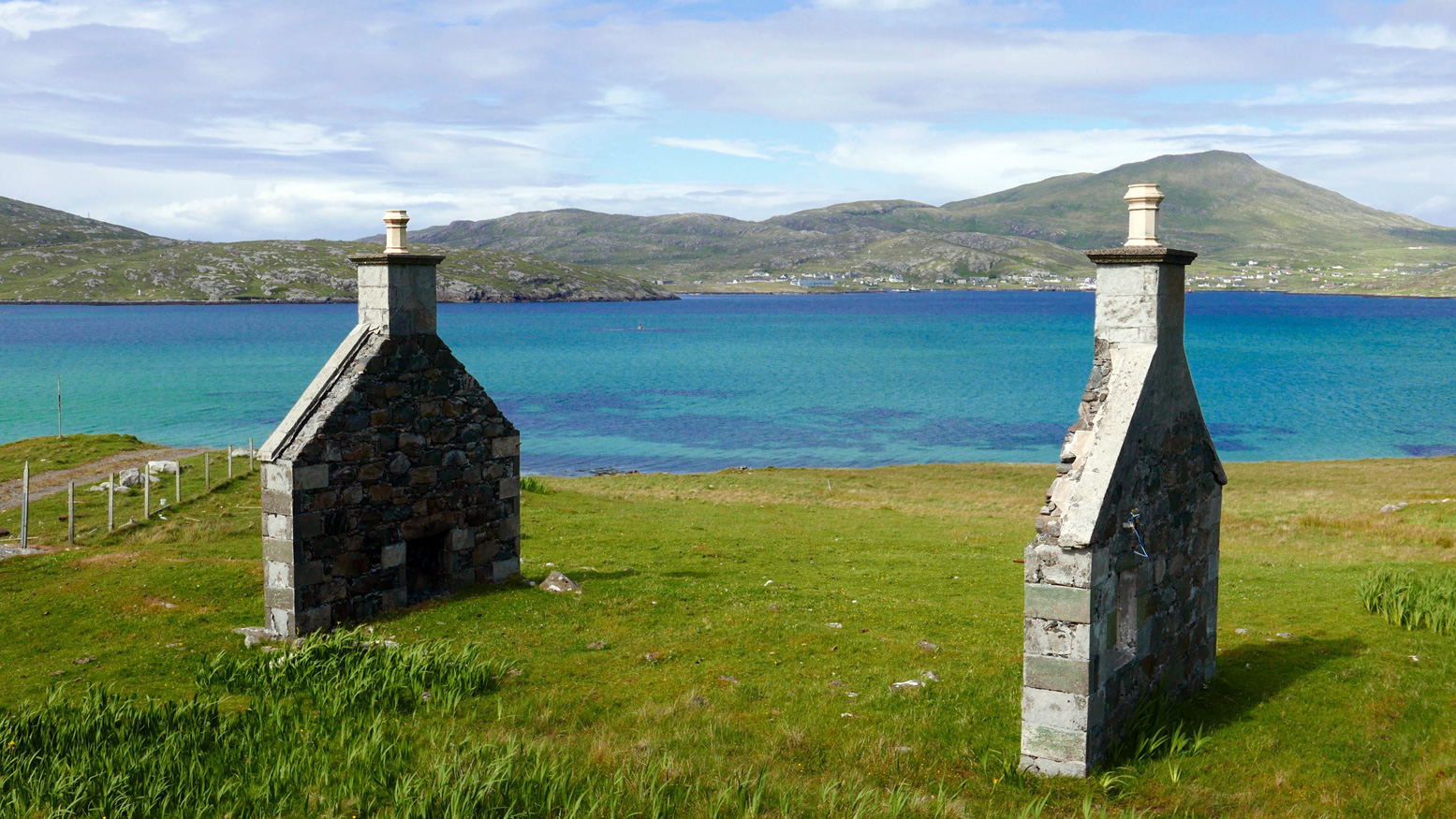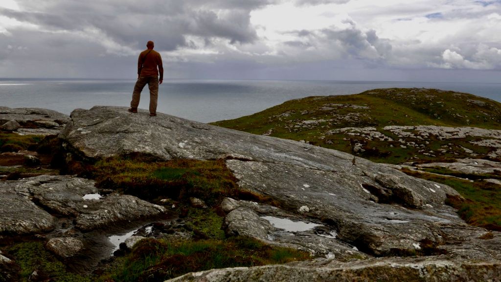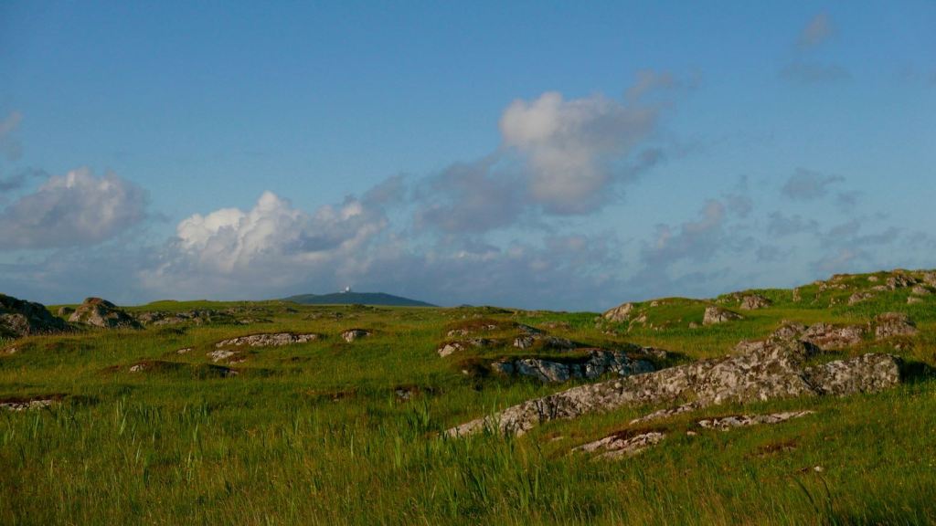 Next day I did another sunny lap of the island then caught the once-weekly ferry to Barra at the southern end of the Outer Hebridean archipelago and once ashore wiggled my way down south over a causeway to Vatersay. Evoking the former Nordic occupation of what they’d called Havbredey, the ‘Isles on the Edge of the Sea’, I parked up and scrambled up to the trig point on Heiseabhal Mor, the westernmost hill in Britain accessible by road and scheduled ferry services. Formed of three-billion-year-old Lewisian gneiss (the oldest rock in Britain) eons of Atlantic gales had shorn the rounded summit into a bald dome.