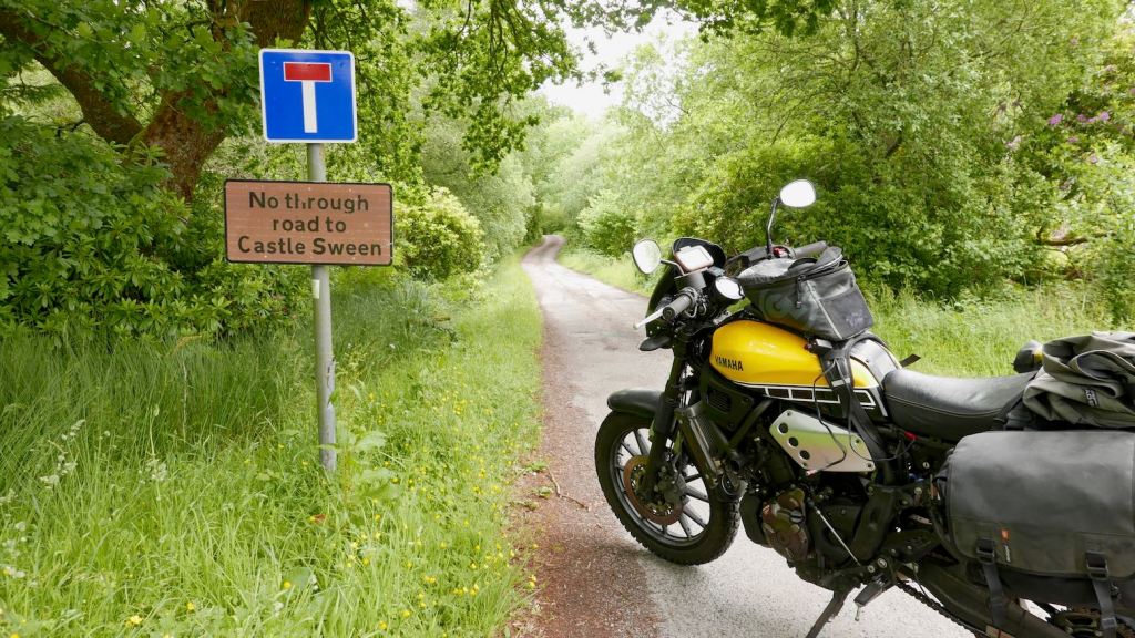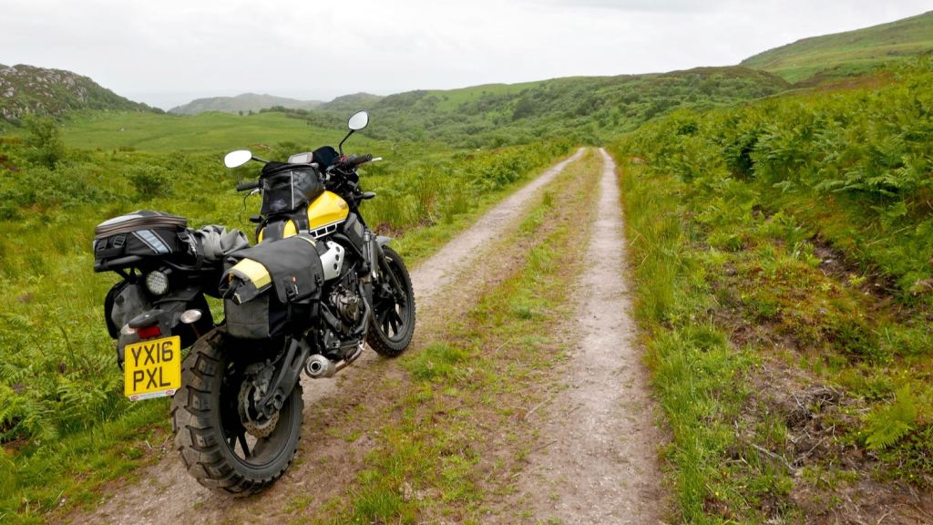 The B8024 leads back to the east coast of the Kintyre peninsula, while on the north side of Loch Caolisport, a side road ends within a couple of miles at Ellary. However, study an OS map and you will see an intriguing hill track which leads up and over the spur to join up with the backroad on the west side. It’s a shame that green laning as we know it in England and Wales is outlawed in Scotland. Walkers, mountain bikers and kayakers can roam and camp freely, but estate landowners and locked gates exclude motorised vehicles. Actually, as someone who enjoys all those recreational activities as much as I do trail biking, I support the restriction. Open to one and you must open to all, including irresponsible twats – in the Covid staycation summer of 2020, this right to roam rule was pushed to the limit in Scotland by motorhomers and the like. This track was closed but some private roads can be used with permission.