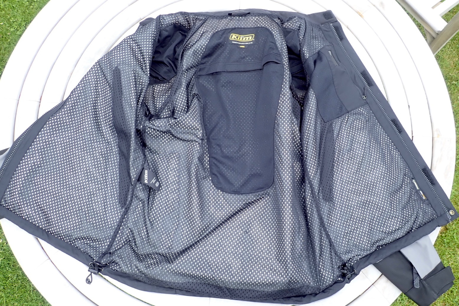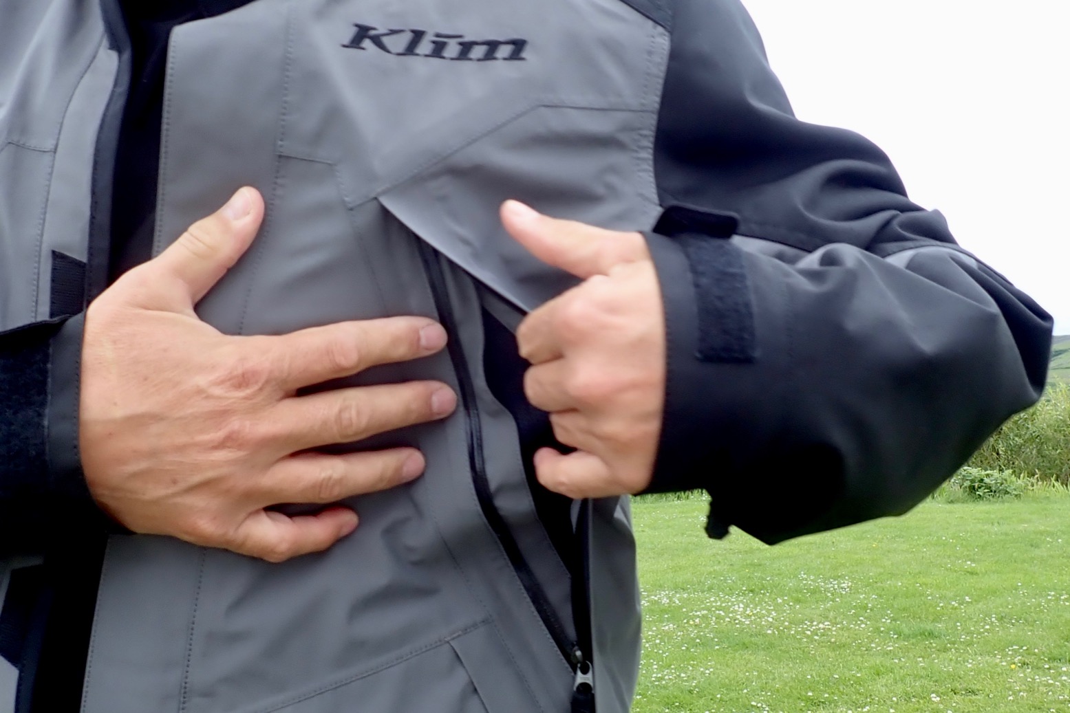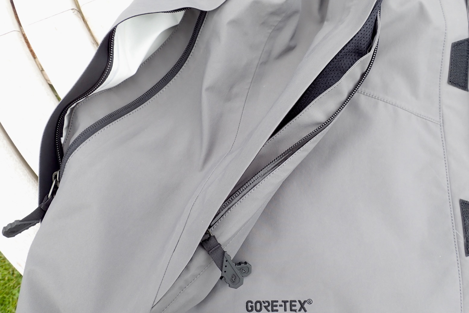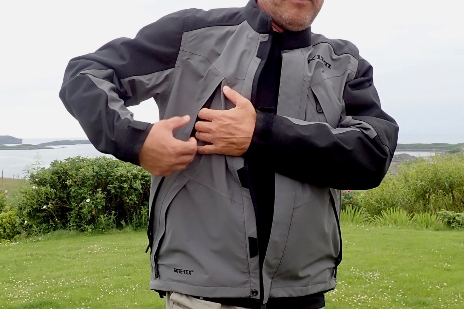 The light, Gore-Tex 2-layer nylon 66 body shell fabric and spread of durable 500D Cordura patches over the arms broad match the Overland – just about adequate for 4-season riding if helped by a heated vest, and up to crashing with a bit of armour. The main zip is two-way, with a velcro rain flap and rain gutter.