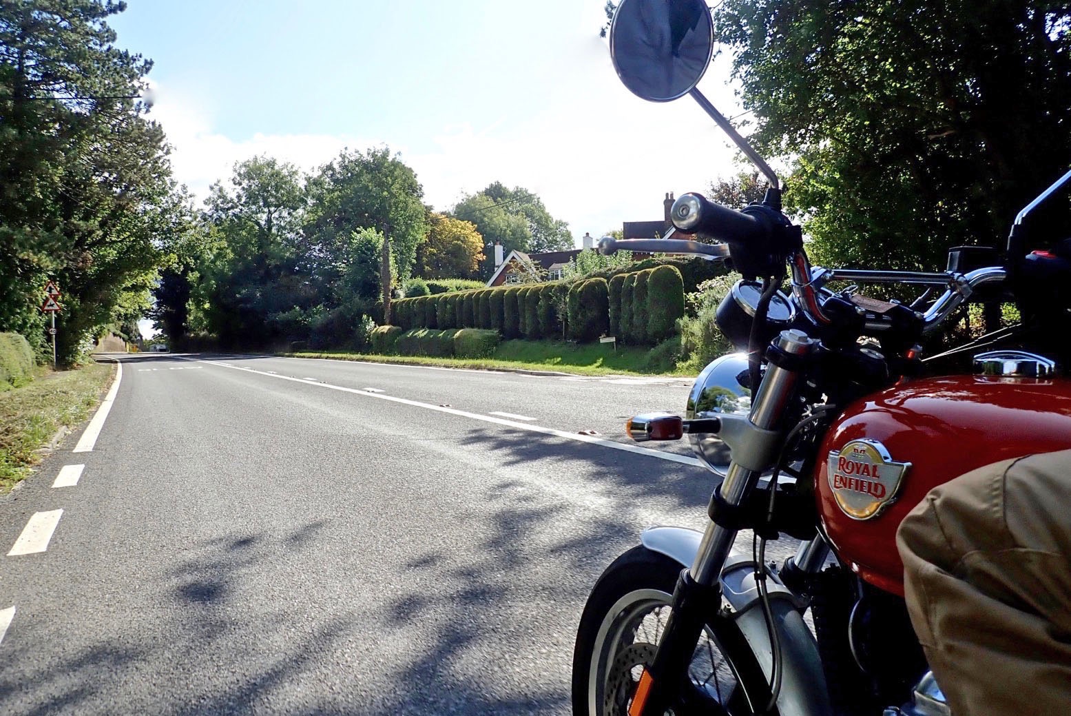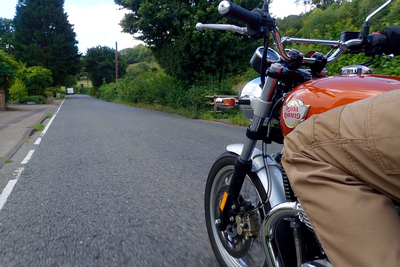 Coming down some steep, shady lanes off the North Downs, the bike really didn’t feel that safe, so in Reigate I pulled into a Shell and put 32psi in the front. Aired up from who knows what pressure and with the sun now out, this was much more like it, at least when I got a chance to let the RE run on between clumps of traffic or cameras. As always, you can’t help comparing a test bike to what you’ve been riding recently and the lighter 650 didn’t feel as planted at my NC, nor was the suspension anywhere as good. Up Chipstead Way the bike (about 211 kilos with the 13.7-litre tank brimmed) was bouncing all over the place. But the motor was much smoother, if lacking the NC’s punchbag-thumping torque, and the light clutch and gearbox as unintrusive as they get.