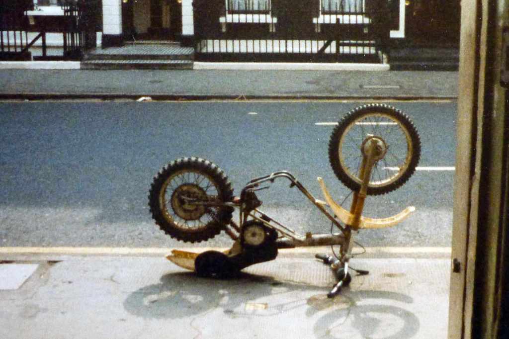 Over the summer of 1984 the machine took shape in my artfully appointed design studio in London’s literary Bloomsbury district. It took two goes to get a bike shop to correct the engine alignment mistakes of the former. But here it was, suspended by some Honda XL250S shocks as long as truncheons, and silenced by VW Beetle tailpipes, a cunning, lightweight trick you may recall from the BMW I rode with in Algeria in 1982.