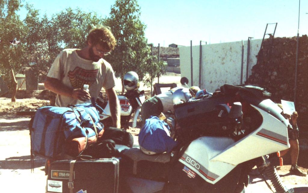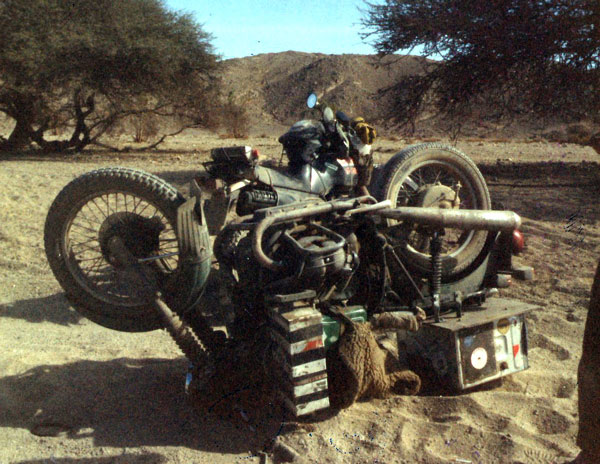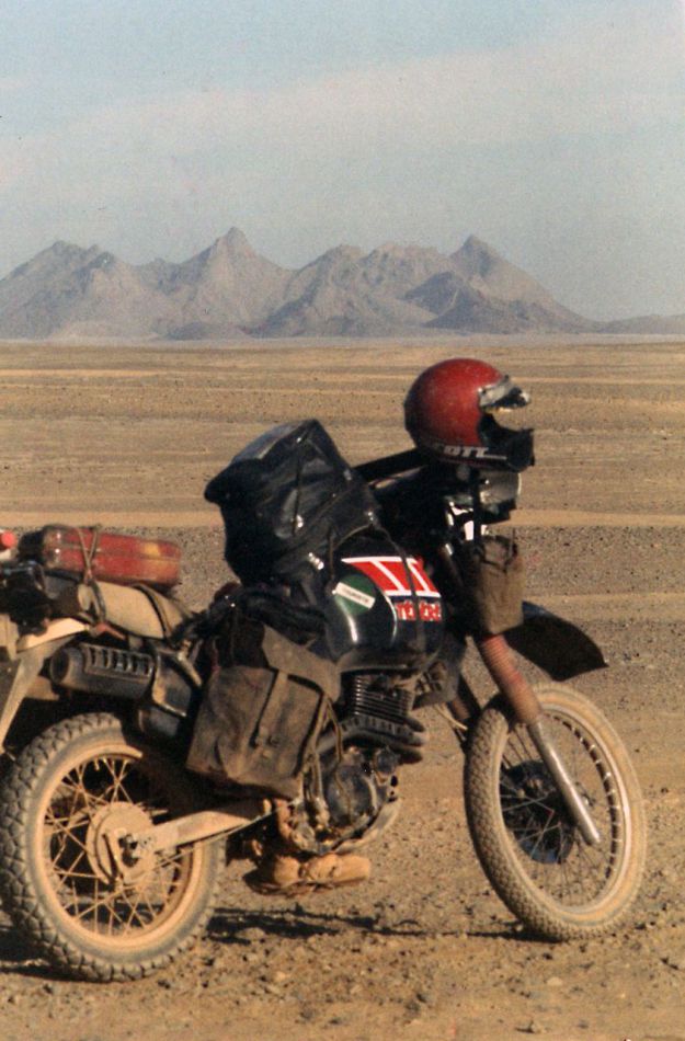 After my batty Benele excursion of 1984 I brushed my hair, straightened my tie and bought myself a sensible XT600Z, just like I always knew I would. This was the slightly better 55W version of the original kick-only Tenere, distinguishable by sloping speedblocks on the tank (more here). All I did was add thicker seat foam and fit some Metzeler ‘Sahara’ tyres – a rubbish choice for the actual Sahara, as I was soon to learn. Using no rack was another mistake which nearly cost me the bike. My learning curve was still as steep and loose as a dune slip face. In fact, there was so little that needed doing to the Yamaha that I moved the oil cooler from down by the carbs up into the breeze over the bars. And I painted the bike black because I still hadn’t shaken off my juvenile Mad Max phase.