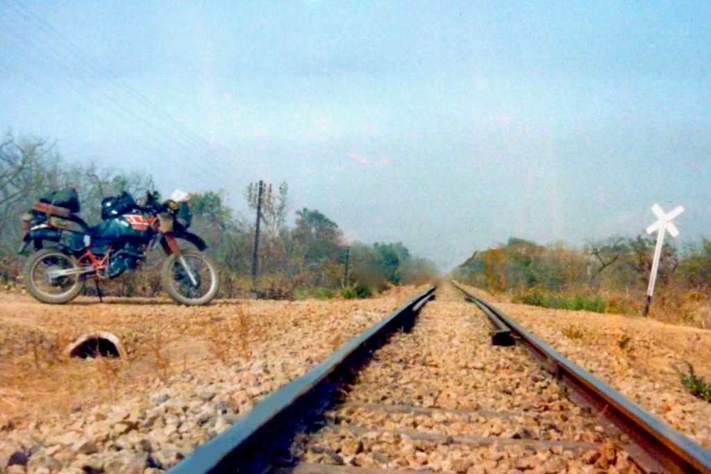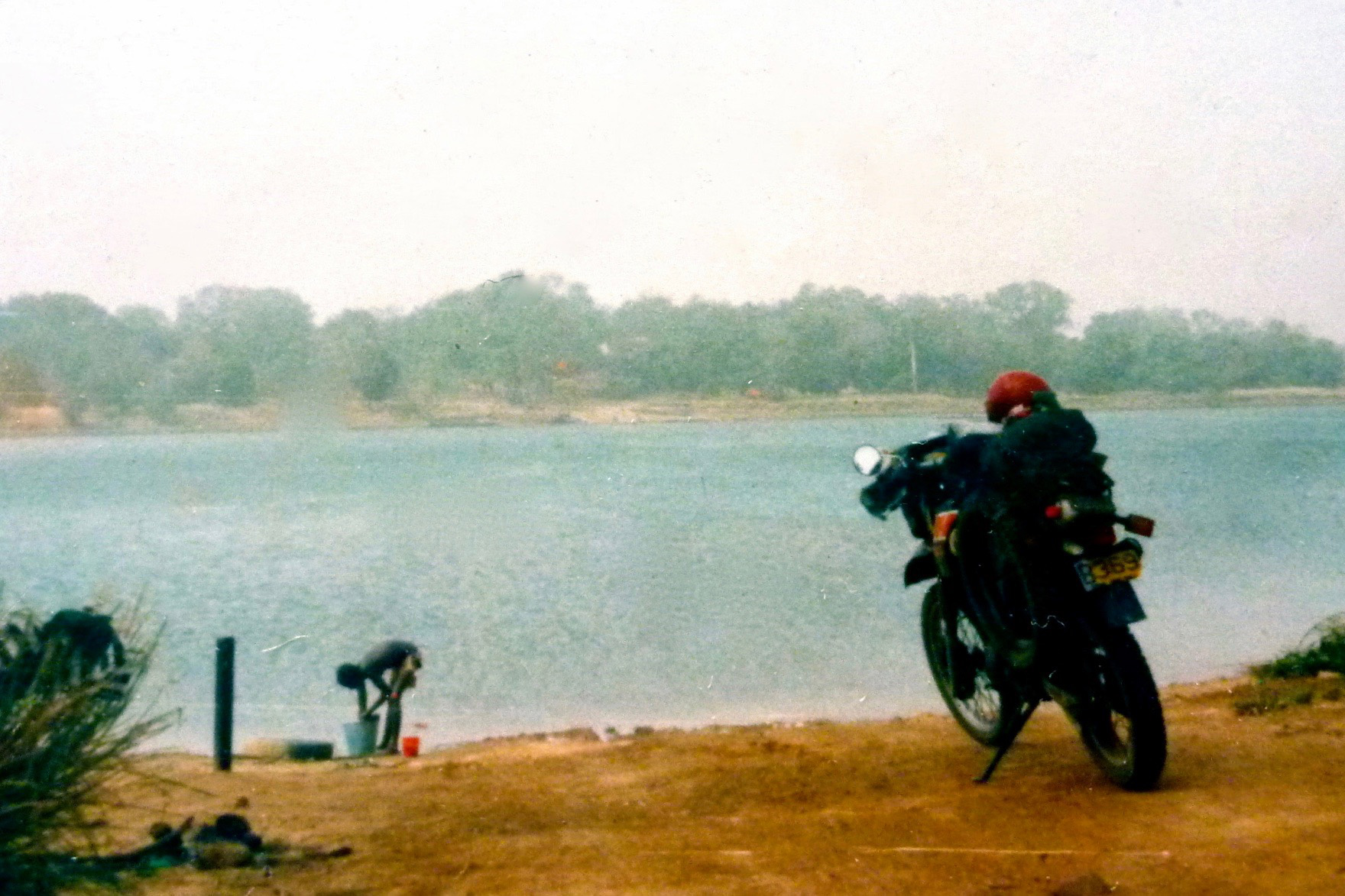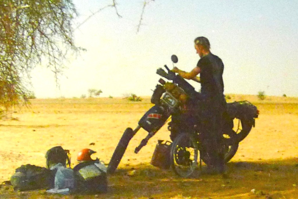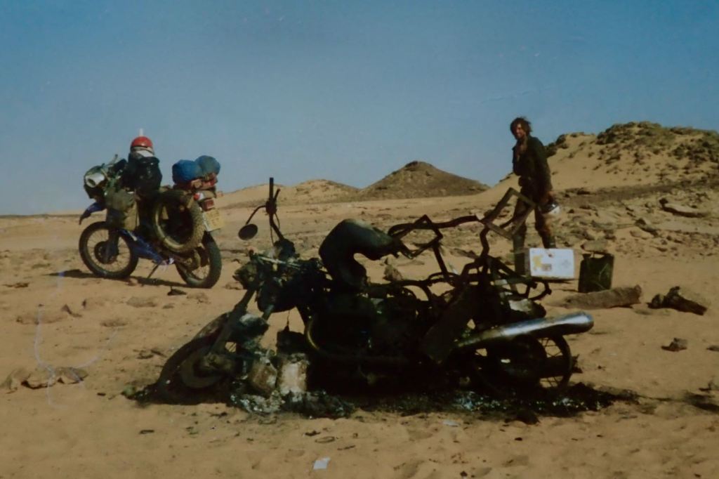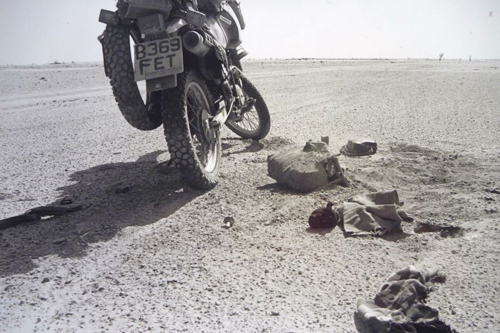 A day or so later, Helmut radically lightens his load after the lessons of the Assekrem excursion and we set off into the night to cross the Sahara to Niger. We camped a short distance out of Tam in the hope of next day getting a good run for the 350km to the border.Next morning we come across some Swiss riders. One of them flipped and cartwheeled his 80G/S andnow it won’t start.Helmut knows his BM from his elbow and sorts it out: a barrel flooded with oil. Look at the huge load on that other Tenere compared to mine. This was one of the reasons why I felt it was my honour-bound duty to write Desert Biking a few years later. That book evolved into the Adventure Motorcycling Handbook and here we all are.As that day wore on, Helmut got progressively more and more tired from frequently falling off his bike. One final crash around dusk finished him and the BMW off.With his shoulder damaged and so unable to ride, I persuaded him to give his BMW a Viking burial with the loads of spare petrol he had left over.The remains of Helmut’s trans-Sahara ride next morning. We abandoned most of his gear and he squeezed on the back of my XT. It was galling for him; he came off quite a lot worse than I did on my first attempt at crossing the Sahara in 1982 on an XT500.After leaving Helmut at In Guezzam, the Algerian border post, I set off across No Man’s Land for Assamaka: the Niger border. It was New Year’s Day, 1986 and the Dakar Rally was setting off from Paris.As I say in book, the Sahara Handbook of the time warned of the very sandy conditions in No Man’s Land, but in fact the terrain wasn’t so bad. When things are tough or tense I tend to press on; when they ease up I feel it’s safe to stop for a breather. So even though it wasted precious film, I had the notion to take some innovative aerial selfies by setting the camera on self timer and throwing it up in the air.Most shots were of gravel or sky, but here’s a superb pre-drone-era snap of the Tenere from 20 feet up.After checking into Niger at Assamaka – a portacabin and mud hut in the middle of nowhere – next day I got lost on the last 200-km stretch to Arlit where the highway resumed. This section in Niger still remains unsealed in 2021; banditry has made the job of completing the trans-Sahara Highway too risky. And not only that but just before I got there, my canvas baggage caught fire (pressing on the pipe; the usual story). One pannier burns merrily in the stiff Saharan breeze.I wasn’t carrying that much stuff; now I had a bit less. Notice the H4 light bulb.My first Saharan crossing had been quite eventful. See the Google Map.A few days later I arrived at the banks of the Niger river. West Africa was a whole different vibe from the Sahara and North Africa.After struggling along the very sandy riverside track from Niamey (Niger) into Mali on those crap tyres, I camped on some dunes above the river. As the sun set, over the river I could hear drums beating in the villages. This was Afrikah, just like in the movies!Next morning I reached Gao, located the ferry over the Niger (there’s a bridge now), and headed straight to Bamako as my Mali visa only lasted a week. But I soon got a puncture and encountered the Blue Man as described in the book. From here on I’d have many punctures from thorns picked up while battling along the sandy bush track to Gao.The famous monoliths near Hombori, Mali.Another monolith in the morning haze.The fabulous Grand Mosque of Djenne (not my picture, can you tell?).I’m now sick with the shits but need to rush on to Senegal before the visa expires. In Bamako I gave up trying to put my bike on the train to Dakar, as most people did back then because the roads were so bad. So I take the direct route to Kayes and the border. After all, I’ve crossed the Sahara and am on a trail bike. How hard can it be?The track follows the Dakar railway which helped with orientation. Just as well as I got lost again and again. Unlike the desert, there are loads of bush tracks linking village to village. Most locals don’t venture much further.Waiting for the non-existent ferry at Bafoulabe. After a while I realised there was a bridge just upriver. How else would the train get across? This was the era before tail tidies and you can see my perspex numberplate has succumbed to the piste; a common problem back then. Small metal plates are better.Rough tracks in west Mali heading towards Kayes. Few people took this route and now I think about it I don’t recall passing any other vehicles in two days. From Kayes it was another 100km to the border which I had to reach that night or I’d turn into a pumpkin.But there was time for a quick look at the Chutes de Gouma, west Mali (see map).