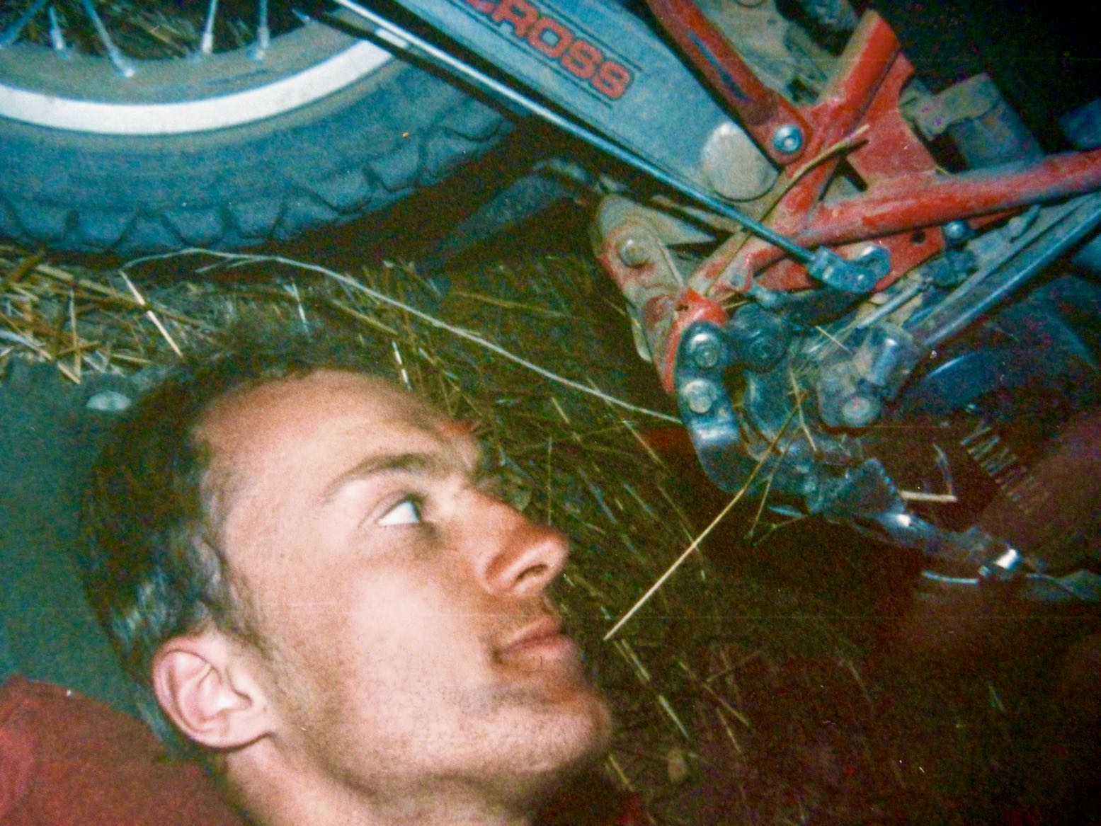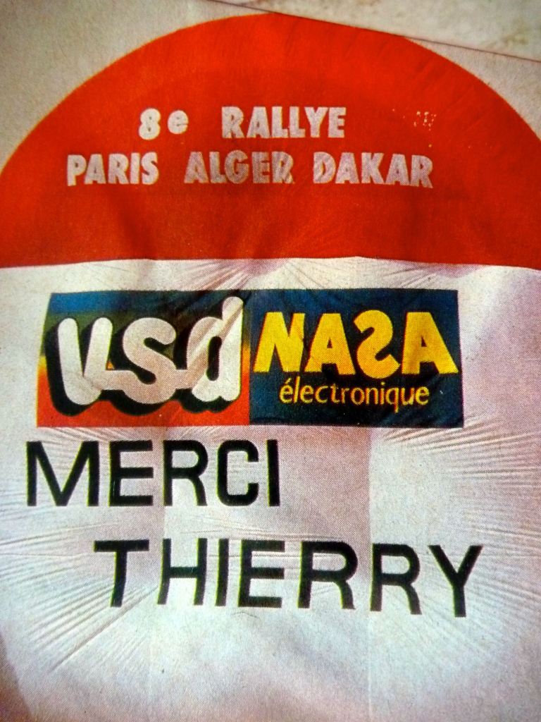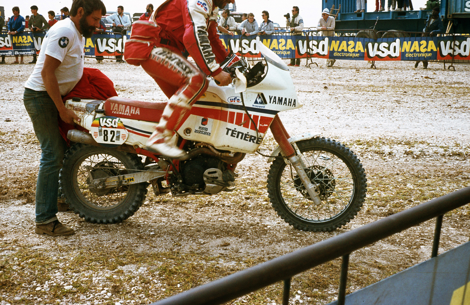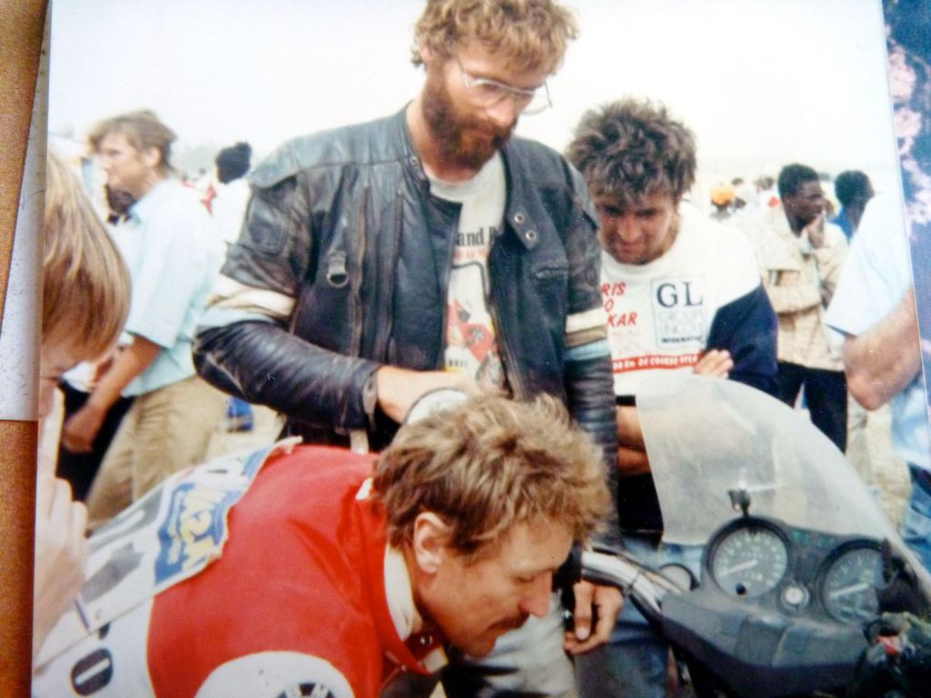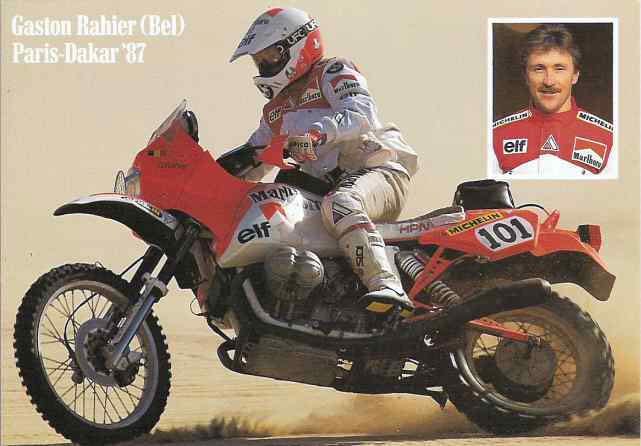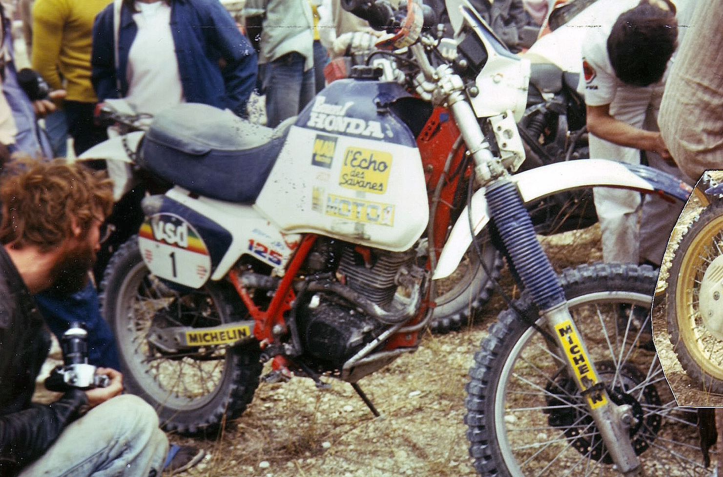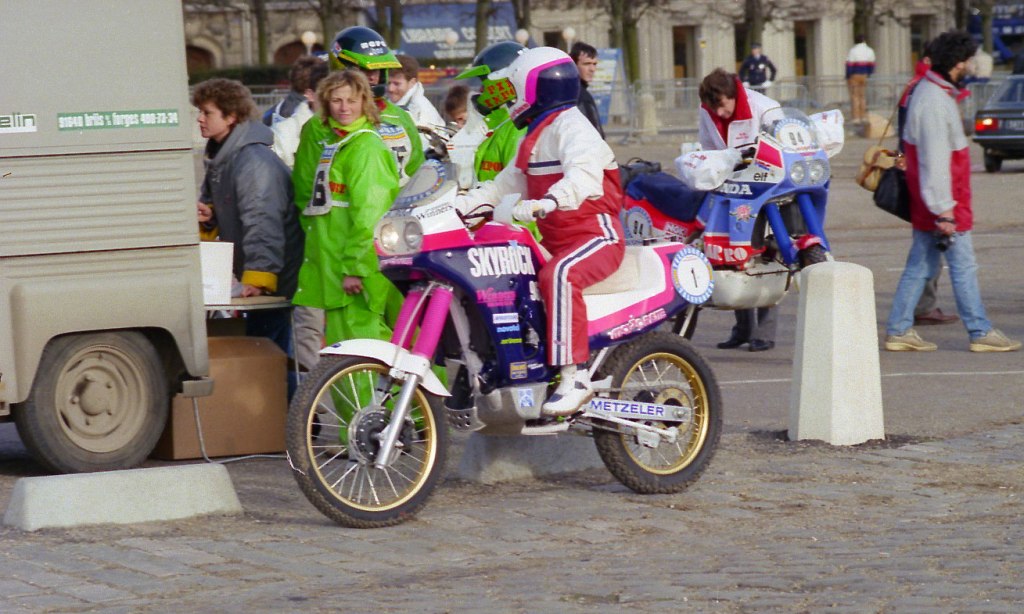 Somewhere after Ambidedi, I crash out under some baobab trees. I was still sick and too tired to carry on, visa or no visa.Next morning I reach the border, now with two flat tyres, but accidentally manage to slip out of Mali unnoticed. With no more patches, I get a train to Tambacounda where I meet Al Jesse, of Jesse Luggage fame. He gives me a spare tyre (my own got ruined from being run flat with the rim lock done up).My cameras had packed up by this stage (another common problem of the era) but I still had film, so Al took some pictures of the Dakar finale for me. Above; Al and Gaston Rahier #101, signing Al’s BMW 80ST which he’d ridden down from the Arctic Circle in Norway, two-up.Gaston Rahier in action.The Marlboro-Elf team. Imagine racing those tanks off road for up to 1000km a day. Luckily they weren’t shod with Metzeler Sahara Enduro tyres.That year RothmansPorsche 959s got first and second, and so did Cyril Neveu and Giles Lalay (above) on Rothmans Honda NXR 780s (which became the original XRV 650 Africa Twin two years later). Go Rothmans. Go Gauloises; Go Chesterfield. If that won’t get you smoking, nothing will! Serge Bacou – cool centre stand (not my pic)Yamaha factory racer Andrea Marinoni in DakarAl inspects a Honda 125 #1. Thanks to this handy website – the best I’ve found for all things Dakar bikes – I was told it was the bike of Gerald Barbezant who was a DNF in ’86. .Here he is again, setting off in 1987 on his 3rd Dakar on a somewhat flashier 30-hp Skyrock MTX 125 two-stroke and getting his lurid fork gaiters admired by a lurid lady in lime green PVC. Aged 57, Gerald Barbezant went on to finish the ’93 Dakar (actually Marseille to Red Sea) on his 10th attempt riding a 125 KTM EXC. He started another four Dakars, riding 125s because ‘he never got a full bike licence’. Interview here. Fellow 2001 Dakar competitor Lawrence Hacking was not so complimentary in his book.