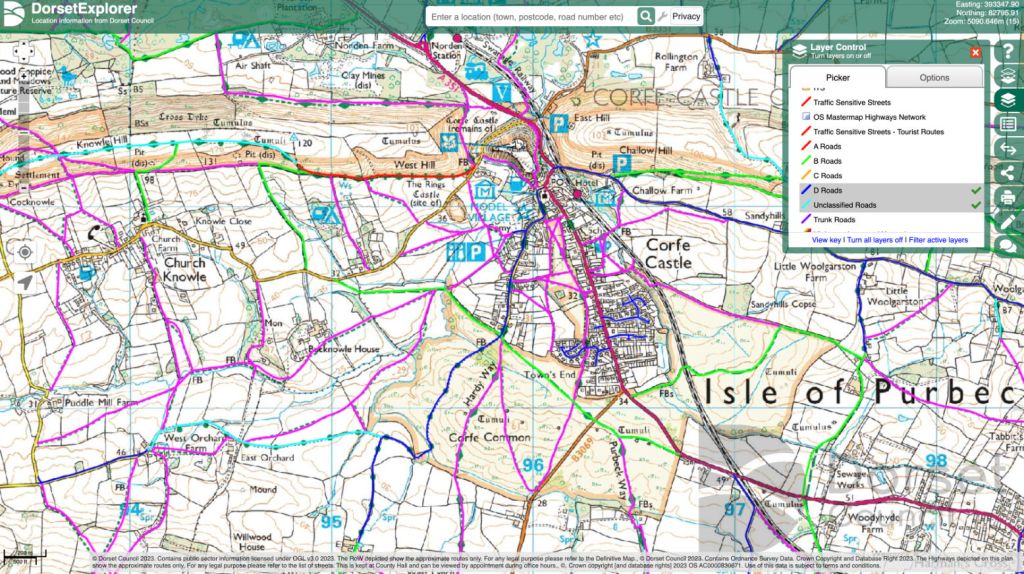 UCRs might be sealed or just tracks, passable or otherwise, but providing they don’t dead end at some backwoods ‘dueling banjo’ meths compound (as I stumbled on the other day), you have the promise of a through route. So I can now verify that track I followed in mid-Wales the other week was a UCR and doesn’t even get any special annotation to the Powys Definitive online map. As DK and DW, a pair of intrepid travel bikers and TRF lifers clarified to me “In 99% of cases, you can legally ride a bike on a UCR“. When you view the Dorset GWT on an OS background, you can see it aligns with UCRs and the much less frequent Byways as well as regular metalled yellow ‘C’ roads.