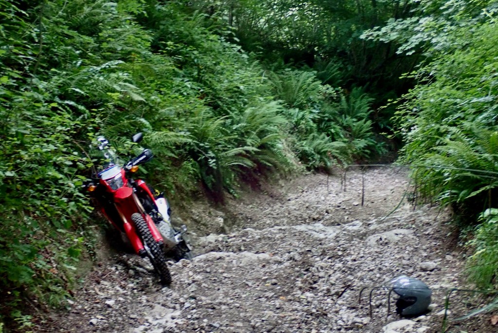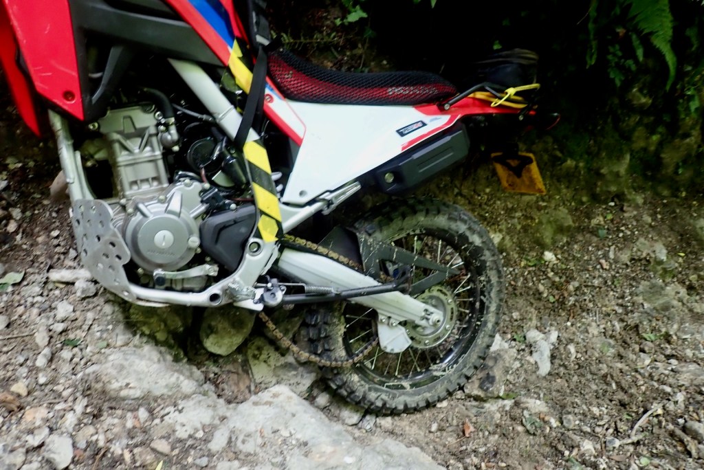 The stock tyres are good but I don’t think will prove very durable; iirc my CRF250L IRC rear didn’t even make 3000 miles in SW USA. As said, the Rally Raid suspension seems dialled in, or if not it won’t be hard to do so. I notice the throttle cables jam solid on full left lock as a result of the taller Renthals; to be expected for a stoop-free standing stance – without risers! Easy to fix or not that important. On the road it zips up to an indicated 60 – going faster needs a big yank on the handle; it’s a 286cc after all.