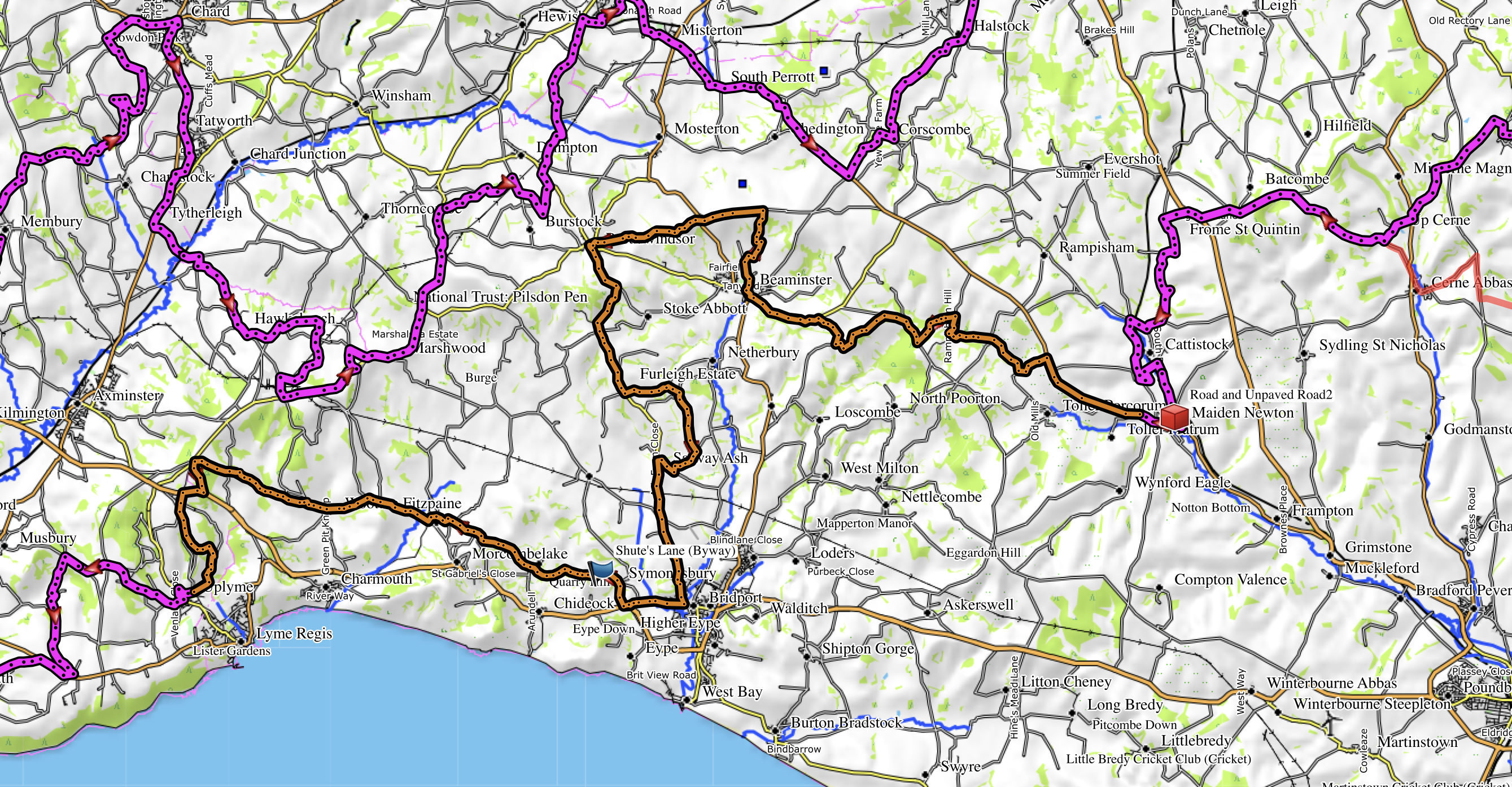 UCRs might be sealed or just tracks, passable or otherwise, but providing they don’t dead end at some backwoods ‘dueling banjo’ meths compound (as I stumbled on the other day), you have the promise of a through route. So I can now verify that track I followed in mid-Wales the other week was a UCR and doesn’t even get any special annotation to the Powys Definitive online map. As DK and DW, a pair of intrepid travel bikers and TRF lifers clarified to me “In 99% of cases, you can legally ride a bike on a UCR“. When you view the Dorset GWT on an OS background, you can see it aligns with UCRs and the much less frequent Byways as well as regular metalled yellow ‘C’ roads.