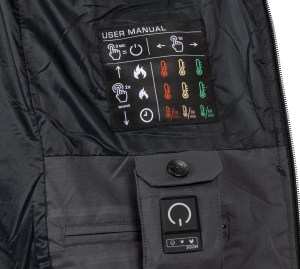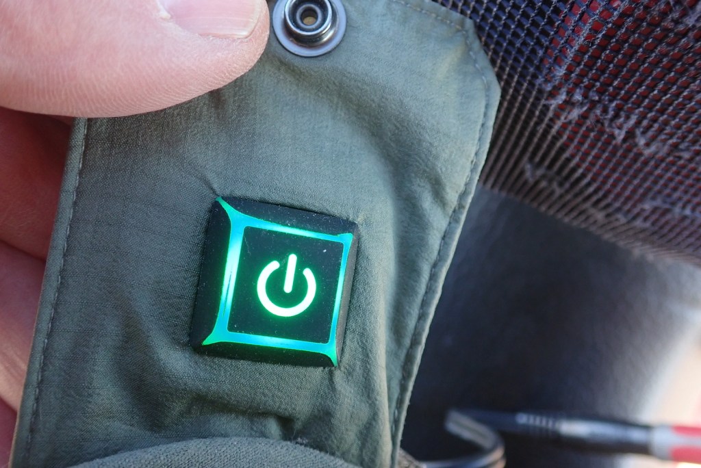 No heat that I could tell so I rummaged around by the jacket’s output and noticed an on-off button which it turns out, has three levels of heat. It cycled red, orange, green then went out. Was it on now? Full power or low?