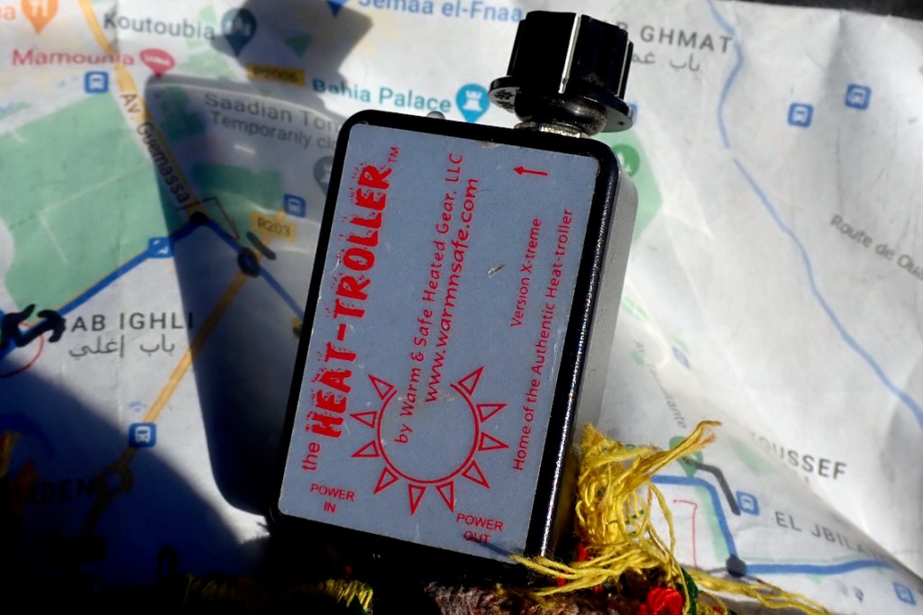Only on the last day, heading over the High Atlas via a high-elevation route at close to zero did I plug the jacket in. I assumed like my previous heated jackets the Ectotherm would have no temperature controls, so used my old dial-operated Heat Troller (above left).