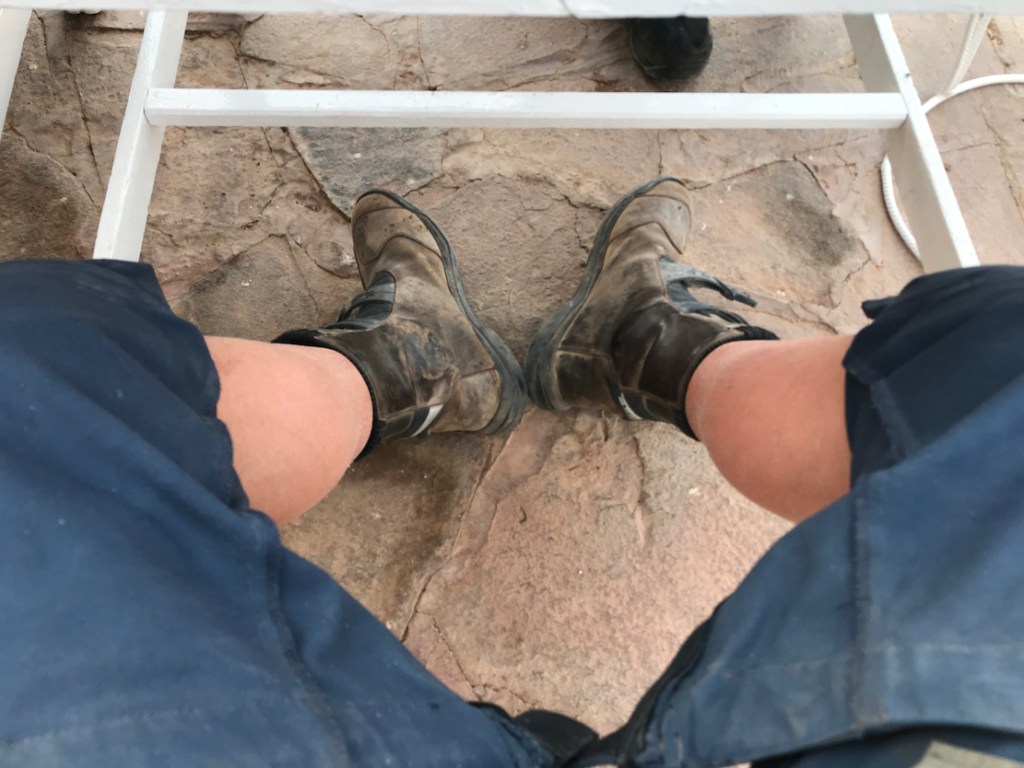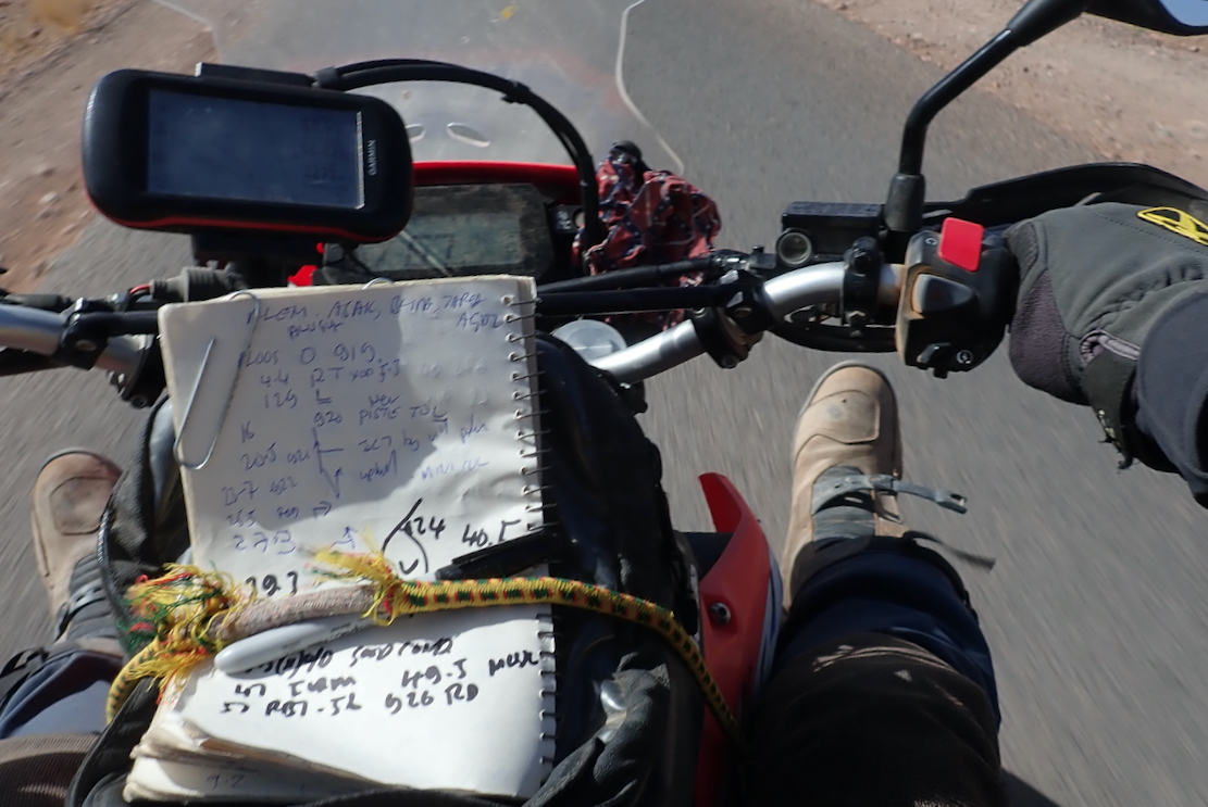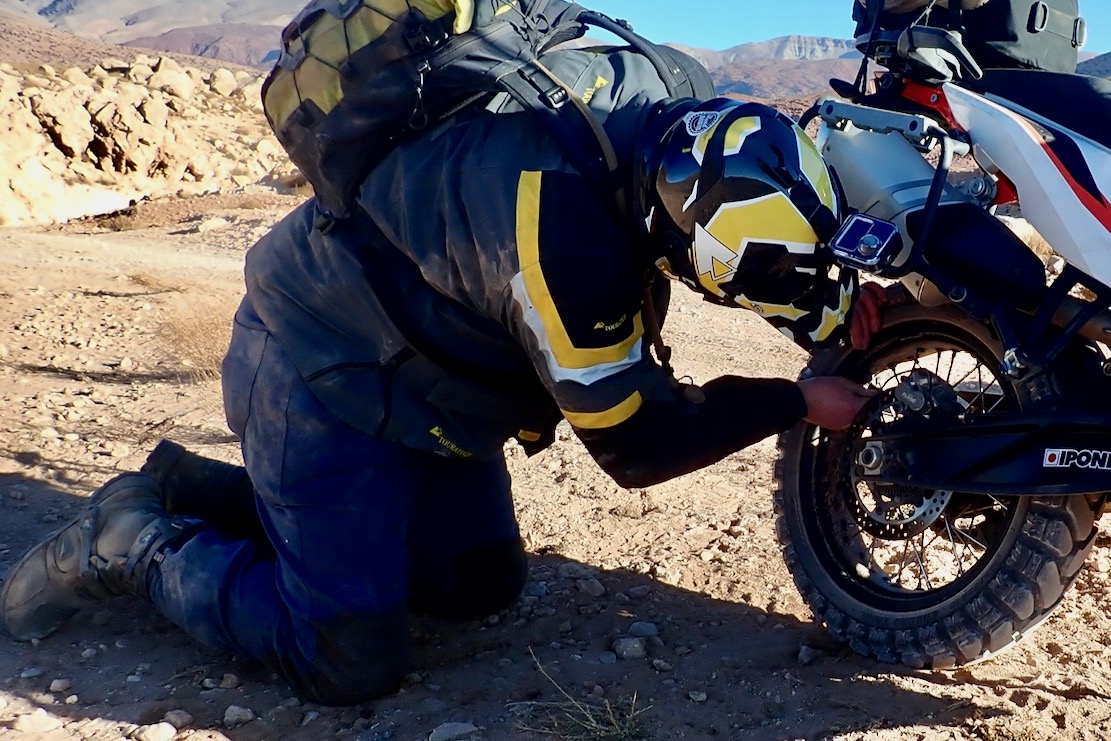 Morocco’s desert-sea-mountain location with its radical elevation and temperature changes make bike clothing choices especially tricky, but in March temperatures rise steeply and by the time it got to the mid-30s°C down south, the Linesmans were just too hot, even on the move, same with the Klim ITBs I tried a few years ago. Meanwhile the baggier, part natural fibre Klim Outriders have proved tolerable in similar heat. I tried undoing the calf zip with little effect. I then tried resting my legs on my Lomo bags (above) to get some wind up them, but that only works on road and is probably not what they teach at CBT school. At least when you stop for a break you can pull them up to air off a bit (below).