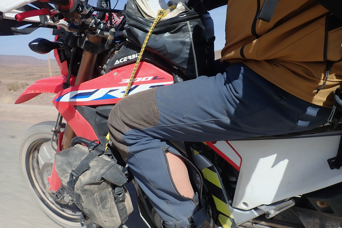 As you can tell, I didn’t gel on with the Linesmans for my sort of riding. But not for the first time my PoV is out on a limb; on the ASpec website comments are broadly positive. Sure, the ankle straps could be snipped off for good, but as expected, once I saw them I suspected the pants would be too hot for Morocco. This is why the lairier designed off-road pants like ITBs, have venting zips and mesh panels.
