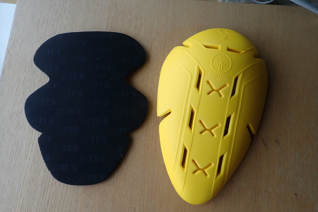There are armour pockets on the hips and of course the knees. Here the lower edge hangs loose so you can slip them into full-height boots to stay in place. Another nice touch. I wear short boots and removed the Forcefields before fitting some 5mm neoprene pads (left) I had going spare.