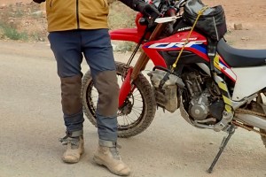 Over a year I’ve worn my Linesman Pants whilst off-road training in Scotland, riding the Kielder 500 rally and around the High Atlas and desert of Morocco in January. And by the time you read this I’ll be out in Morocco riding the Sandraiders rally on my 3AJ. I even wore them with the armour on the Ryanair flight. I surprised UK airport security whilst they frisked me down, but the Moroccan Security agent had obviously come across knee armour before. The blue/black pattern help them look like regular hiking pants.
