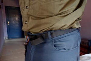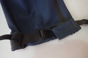First thing I noticed on James’ Linesmans in February was the untidy strap at the ankle. Linesmans are designed as close-fitting OTB trousers, with a zip down the calf covered by a small velcro tab at the ankle. Is a strap also needed and, if yes, could not a way be found to reliably tuck away the loose end like Kriega manage on their packs? I tried wrapping the loose strand around the belt loop (above) but of course it worked its way loose.