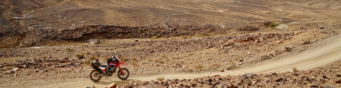 My unconventional rackless placement of a Kreiga low and forward on the LHS pillion footrest worked faultlessly, even with plenty of paddling through oueds and over rocky sections. I never even noticed it was there. The weight position must be as optimal as it gets and it hasn’t budged. It’s such a neat idea next time I’ll do both sides and ditch that tail pack which, handy though it is, makes getting on and off elegantly a pain.