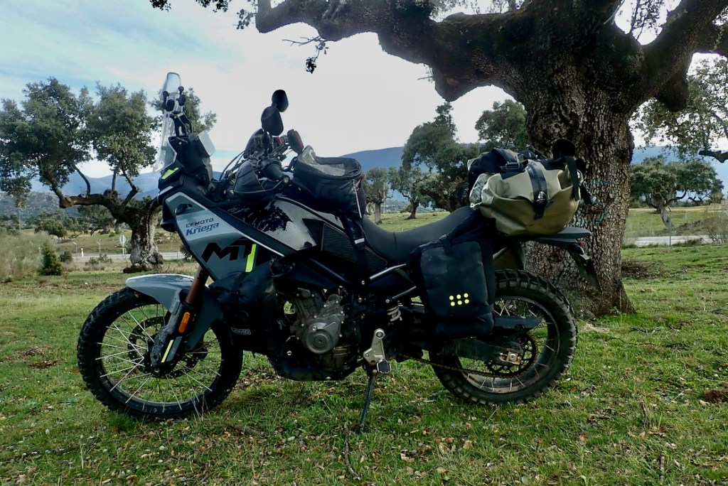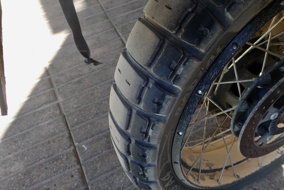 On other occasions I thought perhaps the rubber needed to warm up in the chilly morning temps. This uneasiness came and went right across Spain until I thought: I can’t sell this bike with these Big Blocks, even if they make the bike look rufty-tufty and purposeful. Whoever buys it is likely to be a road rider. Once back in the UK I fitted some Mitas E07s (below) and will flog the Big Bs.