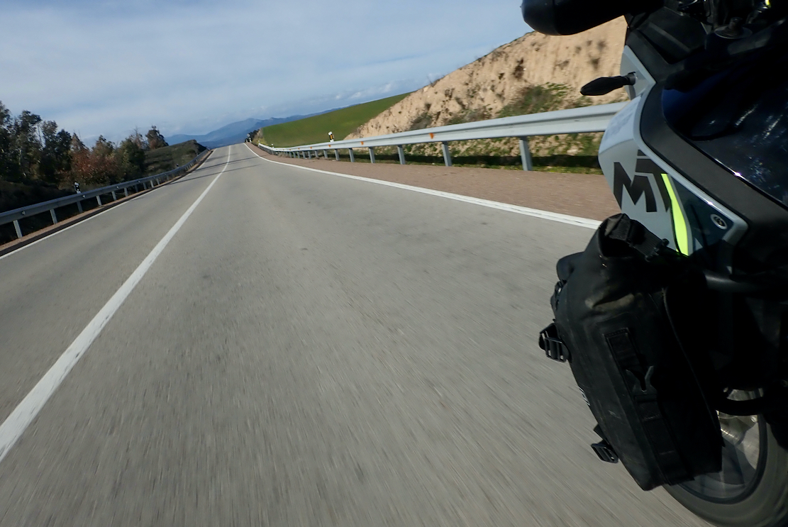 Riding damp, winding mountain backroads from Seville to Granada, I had a couple of slips and at one point was so sure both tyres were punctured, I pulled over to check. Both were solid as. It wasn’t icy but I thought maybe I’d ridden through some unseen, oily agri-slime, or the dealer service in Seville the previous day had whacked up the pressures. Both tyres checked in at the regular 30psi.