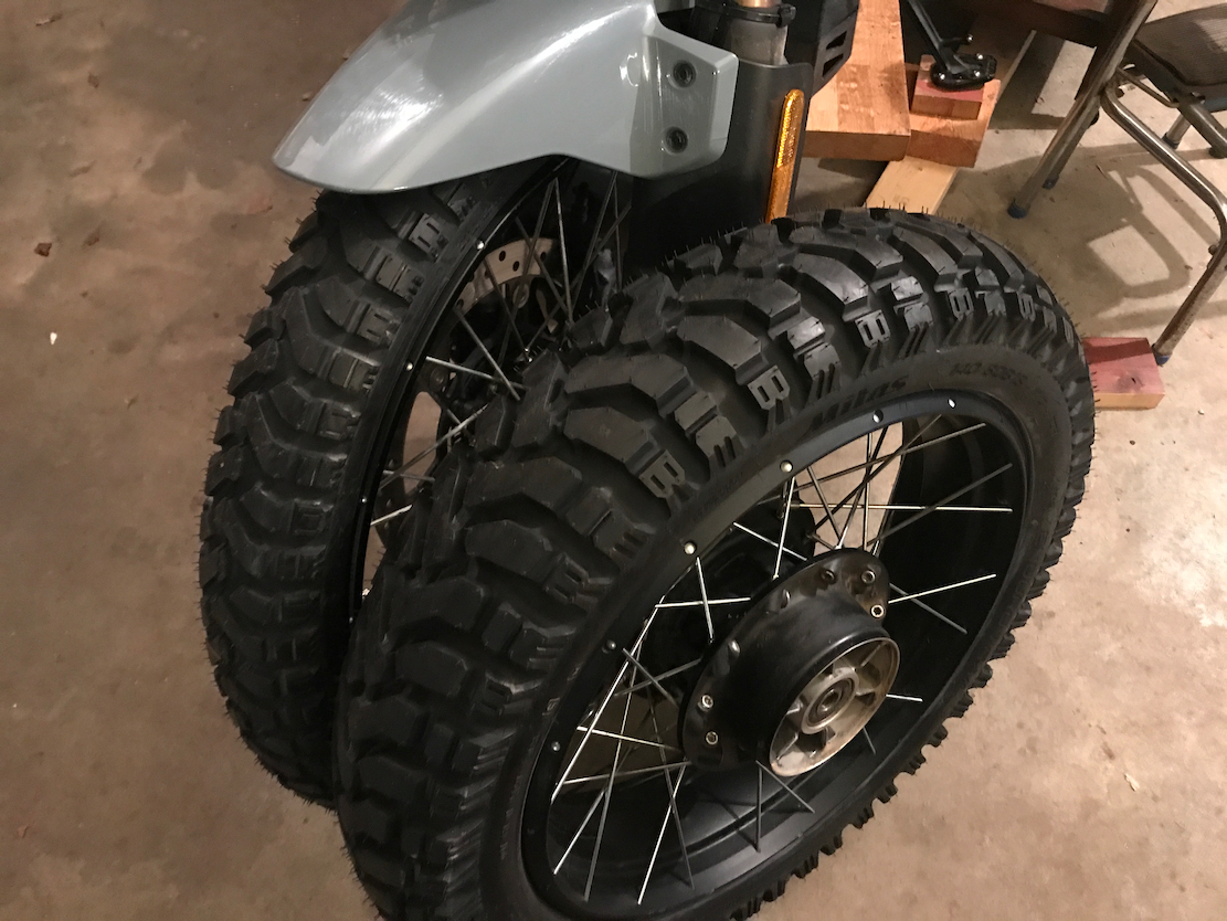 The rear is listed as 140/70-18, but I’m told this size is rare, so the 140/80 rear Kenda would be a bit wider, taller and probably heavier.